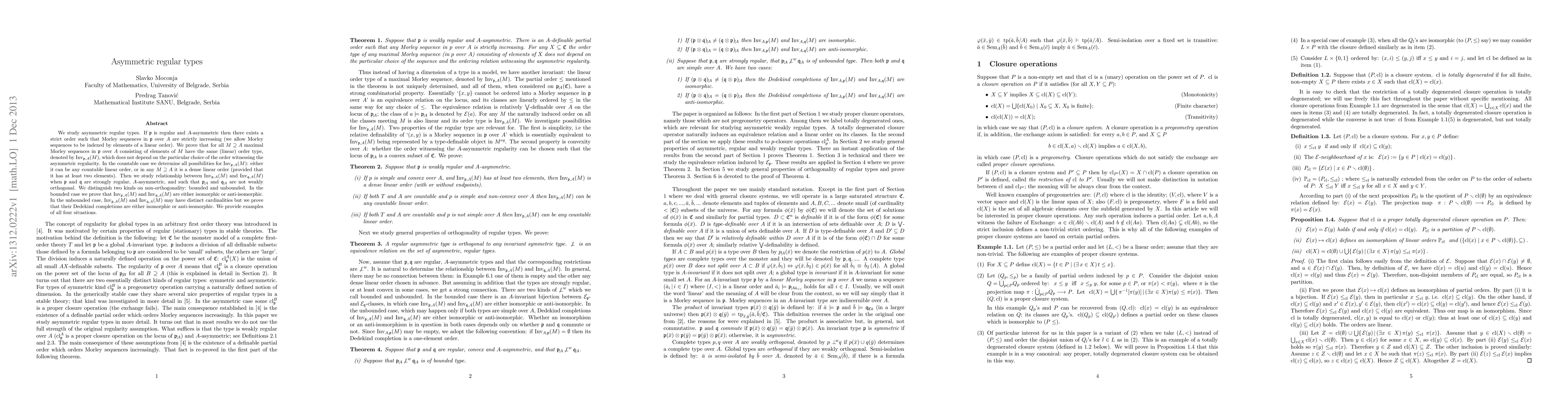 We study asymmetric regular types. If $\frak p$ is regular and $A$-asymmetric then there exists a strict order such that Morley sequences in $\frak p$ over $A$ are strictly increasing (we allow Morley sequences to be indexed by elements of a linear order). We prove that for all $M\supseteq A$ maximal Morley sequences in $\frak p$ over $A$ consisting of elements of $M$ have the same (linear) order type, denoted by $\Inv_{\frak p,A}(M)$, which does not depend on the particular choice of the order witnessing the asymmetric regularity. In the countable case we determine all possibilities for $\Inv_{\frak p,A}(M)$: either it can be any countable linear order, or in any $M\supseteq A$ it is a dense linear order (provided that it has at least two elements). Then we study relationship between $\Inv_{\frak p,A}(M)$ and $\Inv_{\frak q,A}(M)$ when $\frak p$ and $\frak q$ are strongly regular, $A$-asymmetric, and such that $\frak p_{\strok A}$ and $\frak q_{\strok A}$ are not weakly orthogonal. We distinguish two kinds on non-orthogonality: bounded and unbounded. In the bounded case we prove that $\Inv_{\frak p,A}(M)$ and $\Inv_{\frak q,A}(M)$ are either isomorphic or anti-isomorphic. In the unbounded case, $\Inv_{\frak p,A}(M)$ and $\Inv_{\frak q,A}(M)$ may have distinct cardinalities but we prove that their Dedekind completions are either isomorphic or anti-isomorphic. We provide examples of all four situations.