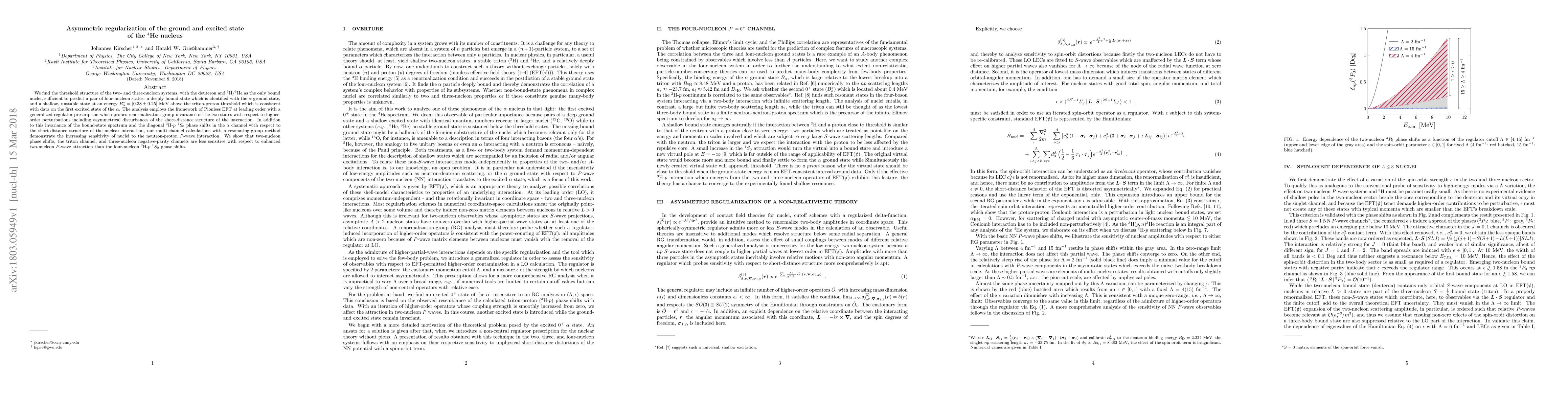 We find the threshold structure of the two- and three-nucleon systems, with the deuteron and 3H/3He as the only bound nuclei, sufficient to predict a pair of four-nucleon states: a deeply bound state which is identified with the helium-4 ground state, and a shallow, unstable state at an energy 0.38(25) MeV above the triton-proton threshold which is consistent with data on the first excited state of helium-4. The analysis employs the framework of Pionless EFT at leading order with a generalized regulator prescription which probes renormalization-group invariance of the two states with respect to higher-order perturbations including asymmetrical disturbances of the short-distance structure of the interaction. In addition to this invariance of the bound-state spectrum and the diagonal triton-proton 1S0 phase shifts in the helium-4 channel with respect to the short-distance structure of the nuclear interaction, our multi-channel calculations with a resonating-group method demonstrate the increasing sensitivity of nuclei to the neutron-proton P-wave interaction. We show that two-nucleon phase shifts, the triton channel, and three-nucleon negative-parity channels are less sensitive with respect to enhanced two-nucleon P-wave attraction than the four-nucleon triton-proton 1S0 phase shifts.