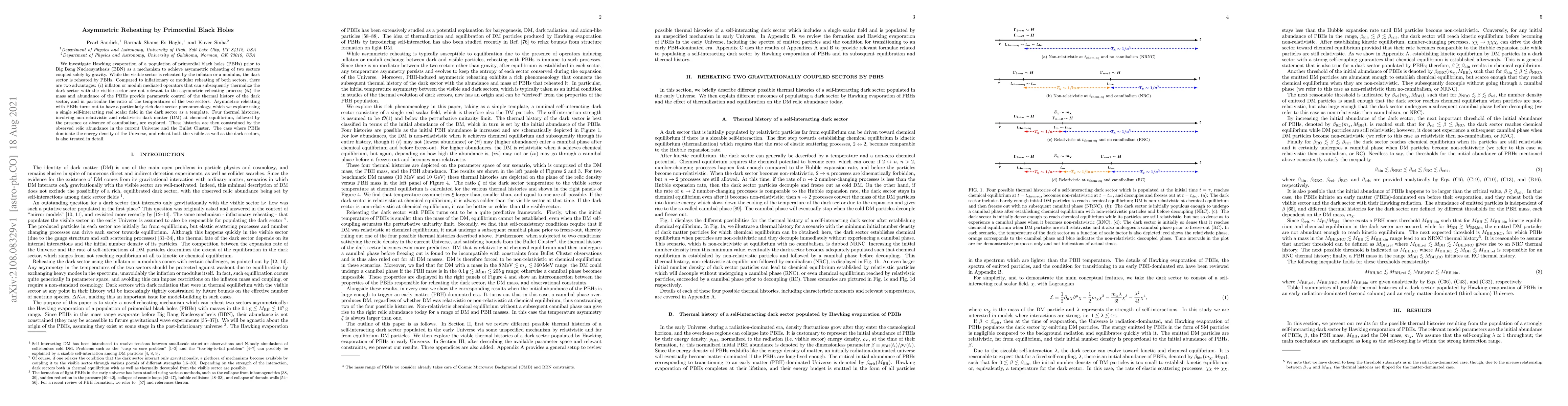 We investigate Hawking evaporation of a population of primordial black holes (PBHs) prior to Big Bang Nucleosynthesis (BBN) as a mechanism to achieve asymmetric reheating of two sectors coupled solely by gravity. While the visible sector is reheated by the inflaton or a modulus, the dark sector is reheated by PBHs. Compared to inflationary or modular reheating of both sectors, there are two advantages: $(i)$ inflaton or moduli mediated operators that can subsequently thermalize the dark sector with the visible sector are not relevant to the asymmetric reheating process; $(ii)$ the mass and abundance of the PBHs provide parametric control of the thermal history of the dark sector, and in particular the ratio of the temperatures of the two sectors. Asymmetric reheating with PBHs turns out to have a particularly rich dark sector phenomenology, which we explore using a single self-interacting real scalar field in the dark sector as a template. Four thermal histories, involving non-relativistic and relativistic dark matter (DM) at chemical equilibrium, followed by the presence or absence of cannibalism, are explored. These histories are then constrained by the observed relic abundance in the current Universe and the Bullet Cluster. The case where PBHs dominate the energy density of the Universe, and reheat both the visible as well as the dark sectors, is also treated in detail.