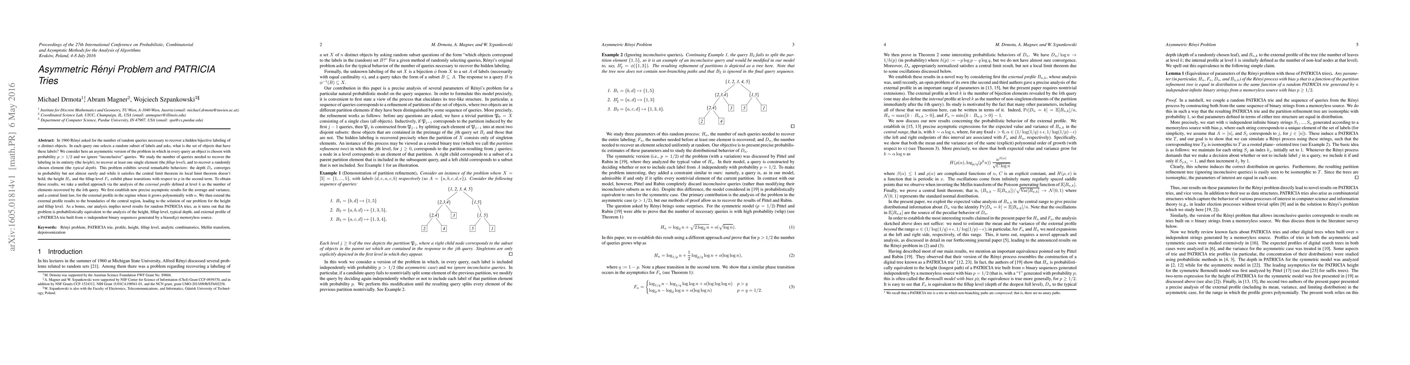 In 1960, R\'enyi asked for the number of random queries necessary to recover a hidden bijective labeling of n distinct objects. In each query one selects a random subset of labels and asks, what is the set of objects that have these labels? We consider here an asymmetric version of the problem in which in every query an object is chosen with probability p > 1/2 and we ignore "inconclusive" queries. We study the number of queries needed to recover the labeling in its entirety (the height), to recover at least one single element (the fillup level), and to recover a randomly chosen element (the typical depth). This problem exhibits several remarkable behaviors: the depth D_n converges in probability but not almost surely and while it satisfies the central limit theorem its local limit theorem doesn't hold; the height H_n and the fillup level F_n exhibit phase transitions with respect to p in the second term. To obtain these results, we take a unified approach via the analysis of the external profile, defined at level k as the number of elements recovered by the kth query. We first establish new precise asymptotic results for the average and variance, and a central limit law, for the external profile in the regime where it grows polynomially with n. We then extend the external profile results to the boundaries of the central region, leading to the solution of our problem for the height and fillup level. As a bonus, our analysis implies novel results for analogous parameters of random PATRICIA tries.