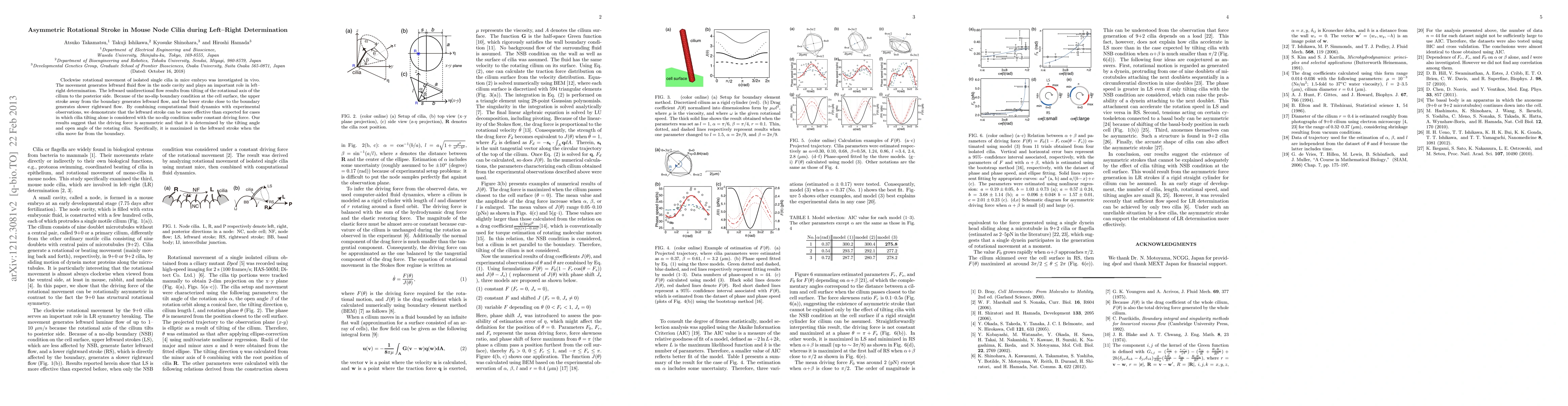 This study investigates the asymmetric rotational movement of mouse node cilia, revealing that the leftward fluid flow is generated by the tilting of the cilia's rotational axis. The findings suggest that the leftward stroke is more effective due to the no-slip boundary condition, indicating an asymmetric driving force determined by cilia tilting and open angles.