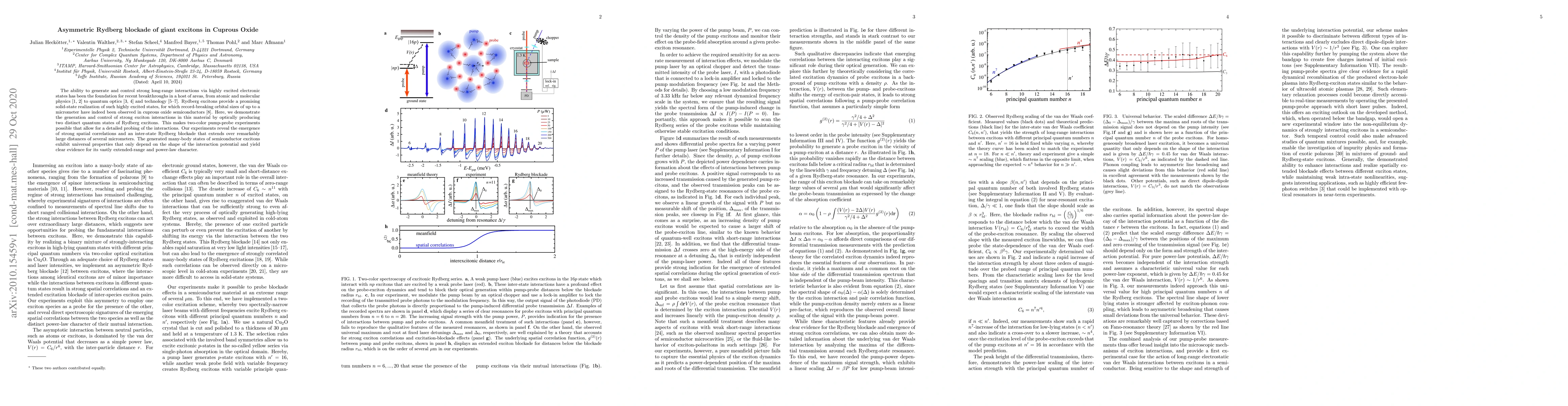 This research demonstrates the generation and control of strong Rydberg exciton interactions in cuprous oxide via two-color pump-probe experiments, revealing extended-range spatial correlations and an inter-state Rydberg blockade over several micrometers, showcasing universal many-body properties dependent on interaction potential shape.