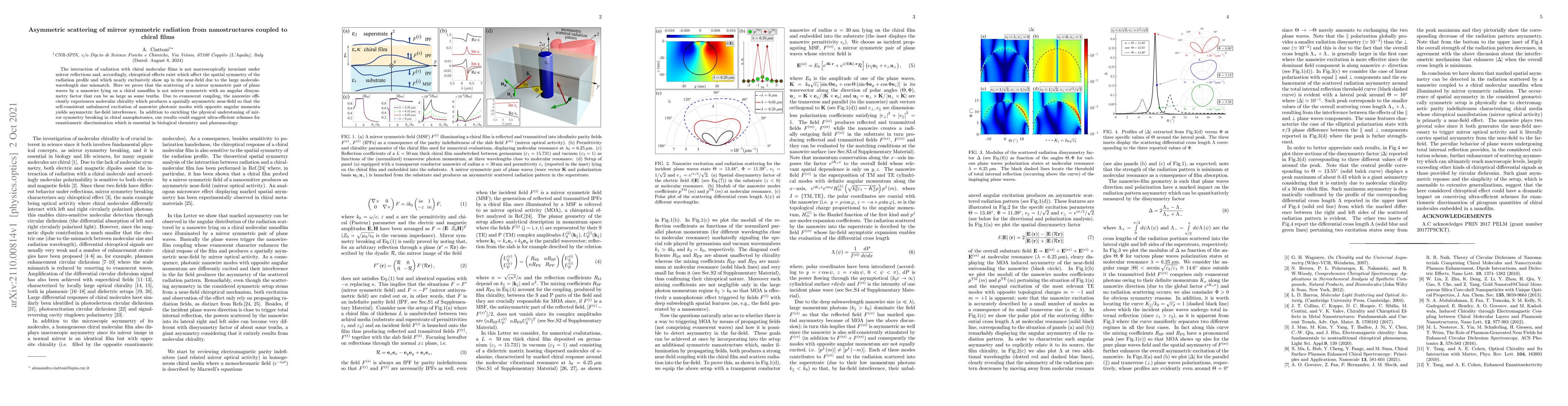 The interaction of radiation with chiral molecular films is not macroscopically invariant under mirror reflections and, accordingly, chiroptical effects exist which affect the spatial symmetry of the radiation profile and which nearly exclusively show up in the near-field due to the large molecule-wavelength size mismatch. Here we prove that the scattering of a mirror symmetric pair of plane waves by a nanowire lying on a chiral nanofilm is not mirror symmetric with an angular dissymmetry factor that can be as large as some tenths. Due to evanescent coupling, the nanowire efficiently experiences molecular chirality which produces a spatially asymmetric near-field so that the self-consistent unbalanced excitation of nanowire photonic modes with opposite angular momenta yields asymmetric far-field interference. In addition to enriching the physical understaning of mirror symmetry breaking in chiral nanophotonics, our results could suggest ultra-efficient schemes for enantiomeric discrimination which is essential in biological chemistry and pharmacology.