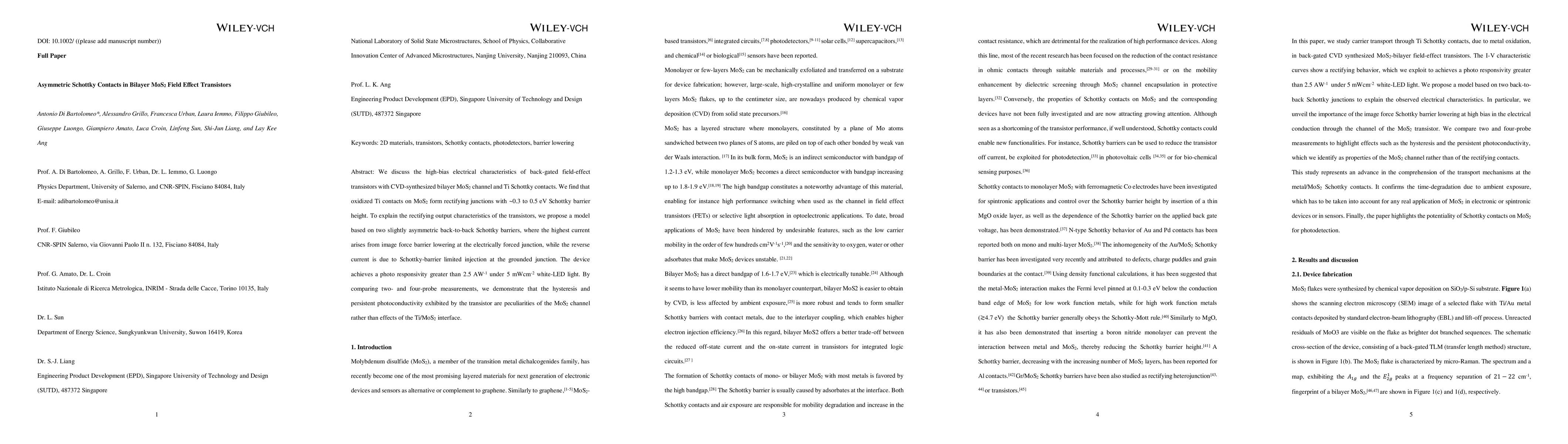 This paper investigates the rectifying behavior of bilayer MoS2 field-effect transistors with Ti Schottky contacts, proposing a model of two asymmetric Schottky barriers to explain the output characteristics. The devices show high photo responsivity and reveal that MoS2 channel properties, not the interface, cause hysteresis and photoconductivity.