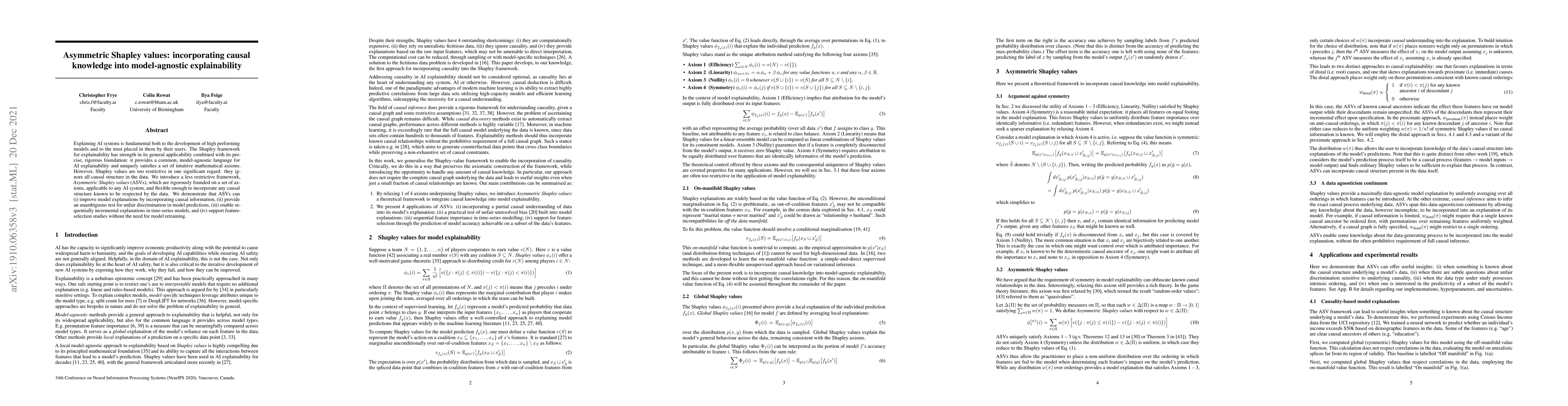 This paper introduces Asymmetric Shapley values (ASVs) to enhance model-agnostic explainability by incorporating causal knowledge, improving explanations, detecting unfair discrimination, enabling time-series incremental explanations, and facilitating feature-selection without model retraining. ASVs offer a flexible framework that satisfies rigorous axioms while addressing the limitations of traditional Shapley values.