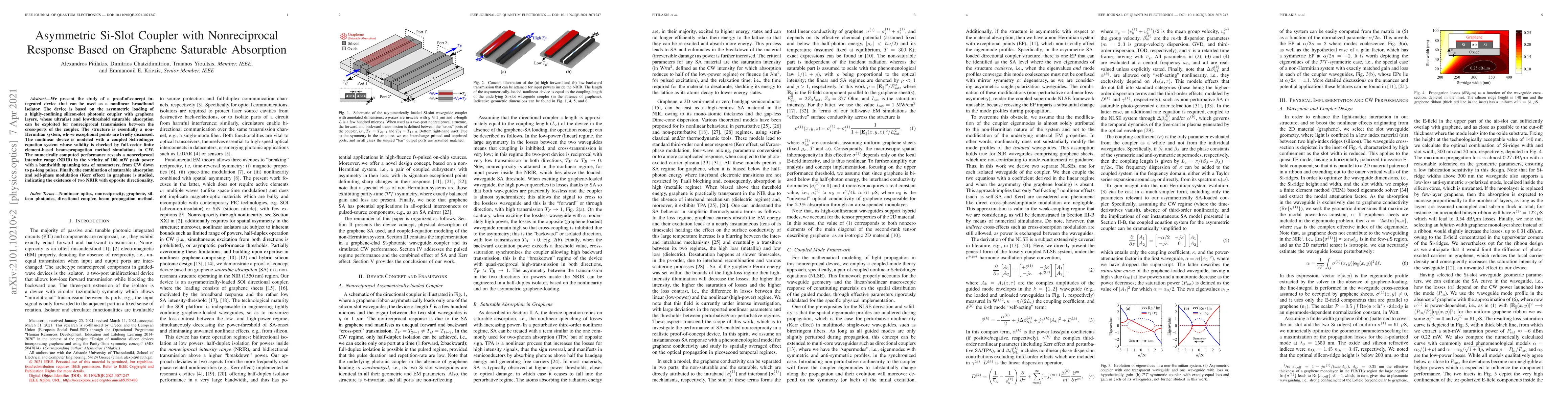We present the study of a proof-of-concept integrated device that can be used as a nonlinear broadband isolator. The device is based on the asymmetric loading of a highly-confining silicon-slot photonic coupler with graphene layers, whose ultrafast and low-threshold saturable absorption can be exploited for nonreciprocal transmission between the cross-ports of the coupler. The structure is essentially a non-Hermitian system, whose exceptional points are briefly discussed. The nonlinear device is modeled with a coupled Schrodinger equation system whose validity is checked by full-vector finite element-based beam-propagation method simulations in CW. The numerically computed performance reveals a nonreciprocal intensity range (NRIR) in the vicinity of 100 mW peak power with a bandwidth spanning tens of nanometers, from CW down to ps-long pulses. Finally, the combination of saturable absorption and self-phase modulation (Kerr effect) in graphene is studied, indicating the existence of two NRIR with opposite directionality.