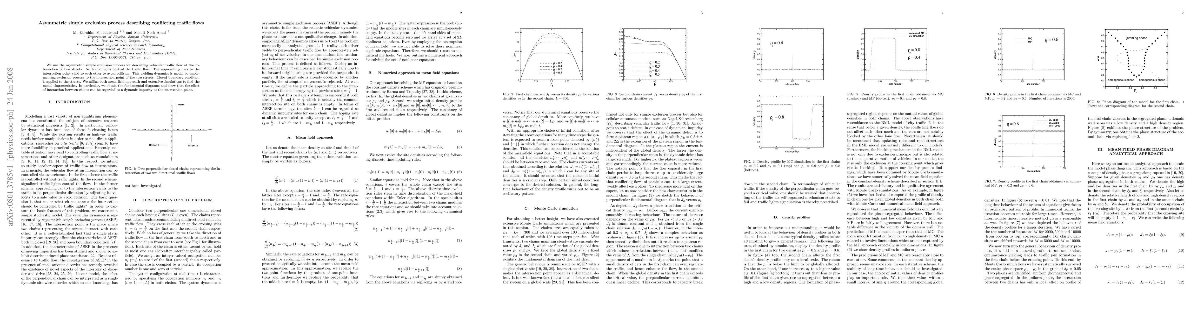 We use the asymmetric simple exclusion process for describing vehicular traffic flow at the intersection of two streets. No traffic lights control the traffic flow. The approaching cars to the intersection point yield to each other to avoid collision. This yielding dynamics is model by implementing exclusion process to the intersection point of the two streets. Closed boundary condition is applied to the streets. We utilize both mean-field approach and extensive simulations to find the model characteristics. In particular, we obtain the fundamental diagrams and show that the effect of interaction between chains can be regarded as a dynamic impurity at the intersection point.