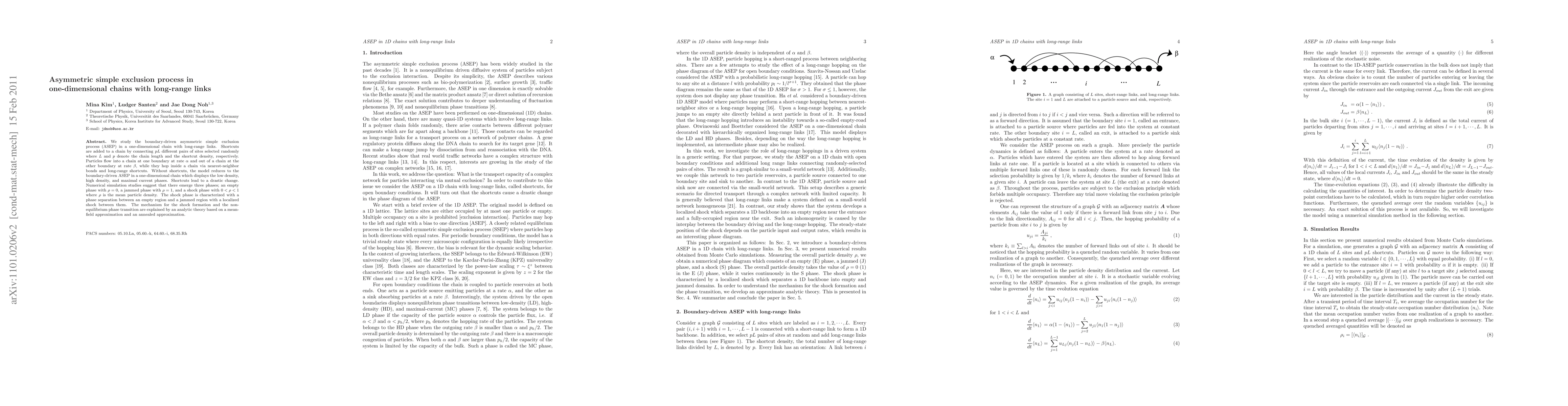 This paper investigates the asymmetric simple exclusion process in one-dimensional chains with long-range shortcuts, revealing three phases: an empty, jammed, and shock phase. The shock phase features a localized density wave between empty and jammed regions, explained through a mean-field and annealed approximation.