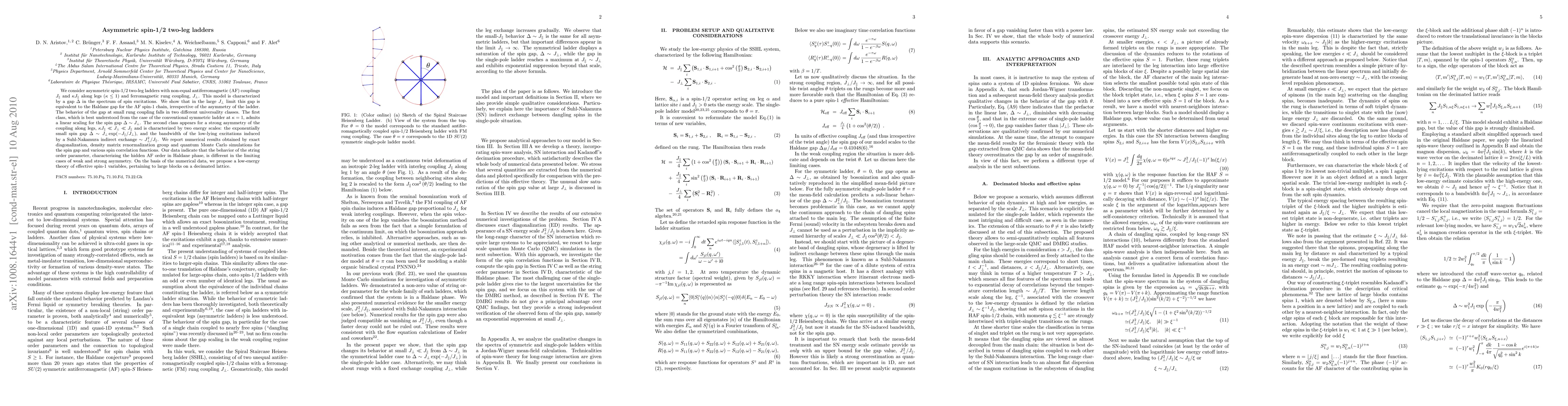 Researchers studied asymmetric spin-1/2 two-leg ladders with different couplings and found a gap in the spectrum of spin excitations that behaves differently depending on the strength of coupling; they propose a low-energy theory for effective spin variables.