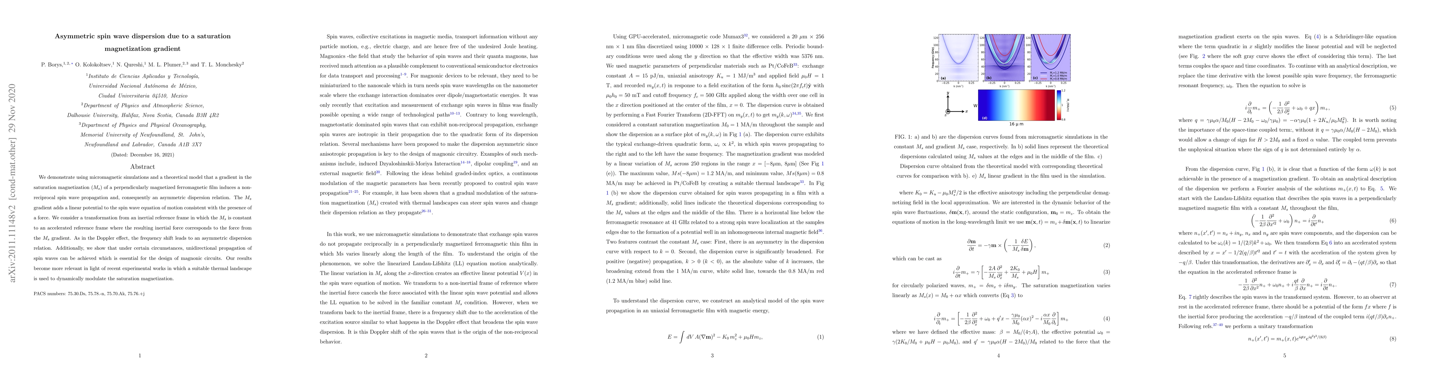 We demonstrate using micromagnetic simulations and a theoretical model that a gradient in the saturation magnetization ($M_s$) of a perpendicularly magnetized ferromagnetic film induces a non-reciprocal spin wave propagation and, consequently an asymmetric dispersion relation. The $M_s$ gradient adds a linear potential to the spin wave equation of motion consistent with the presence of a force. We consider a transformation from an inertial reference frame in which the $M_s$ is constant to an accelerated reference frame where the resulting inertial force corresponds to the force from the $M_s$ gradient. As in the Doppler effect, the frequency shift leads to an asymmetric dispersion relation. Additionally, we show that under certain circumstances, unidirectional propagation of spin waves can be achieved which is essential for the design of magnonic circuits. Our results become more relevant in light of recent experimental works in which a suitable thermal landscape is used to dynamically modulate the saturation magnetization.