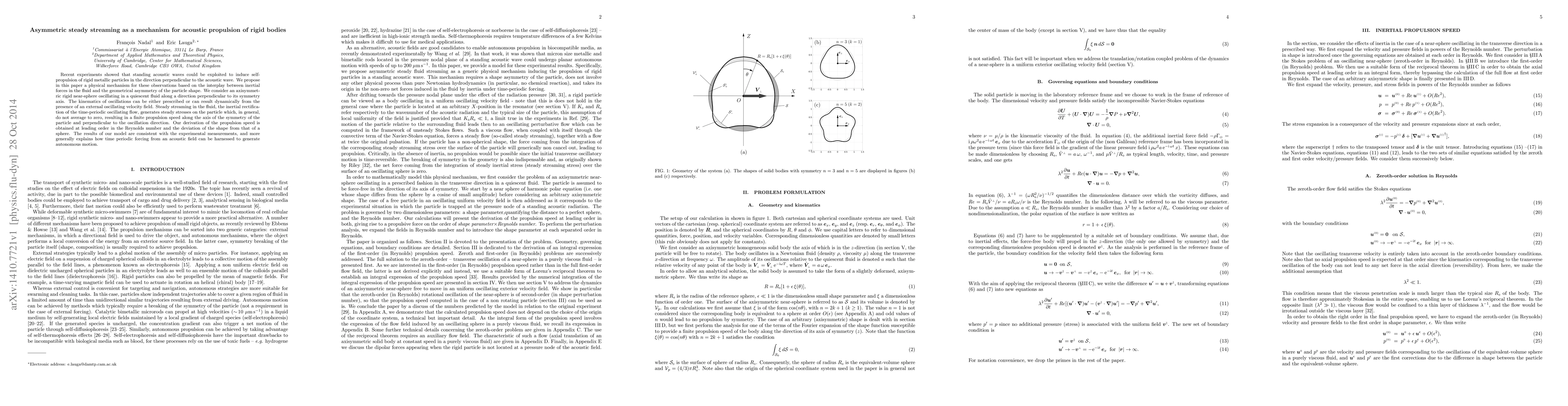 This paper proposes a mechanism for acoustic propulsion of rigid metallic particles using asymmetric steady streaming generated by standing acoustic waves. The model explains how the interplay between inertial forces and particle shape asymmetry leads to propulsion perpendicular to the acoustic wave, consistent with experimental observations.