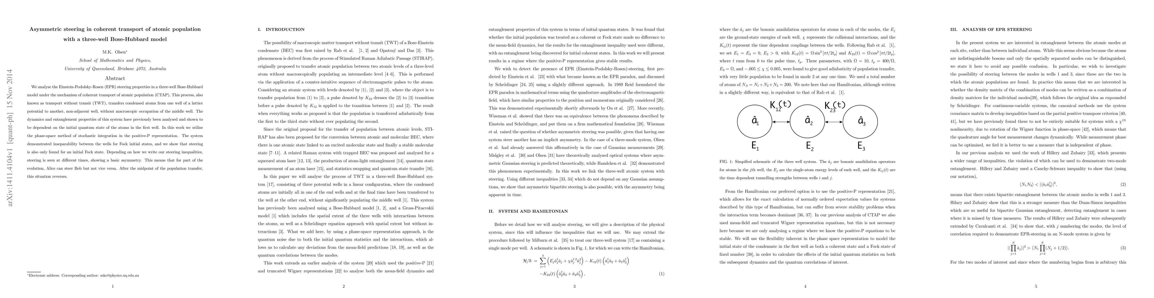 We analyse the Einstein-Podolsky-Rosen (EPR) steering properties in a three-well Bose-Hubbard model under the mechanism of coherent transport of atomic population (CTAP). This process, also known as transport without transit (TWT), transfers condensed atoms from one well of a lattice potential to another, non-adjacent well, without macroscopic occupation of the middle well. The dynamics and entanglement properties of this system have previously been analysed and shown to be dependent on the initial quantum state of the atoms in the first well. In this work we utilise the phase-space method of stochastic integration in the positive-P representation. The system demonstrated inseparability between the wells for Fock initial states, and we show that steering is also only found for an initial Fock state. Depending on how we write our steering inequalities, steering is seen at different times, showing a basic asymmetry. This means that for part of the evolution, Alice can steer Bob but not vice versa. After the midpoint of the population transfer, this situation reverses.