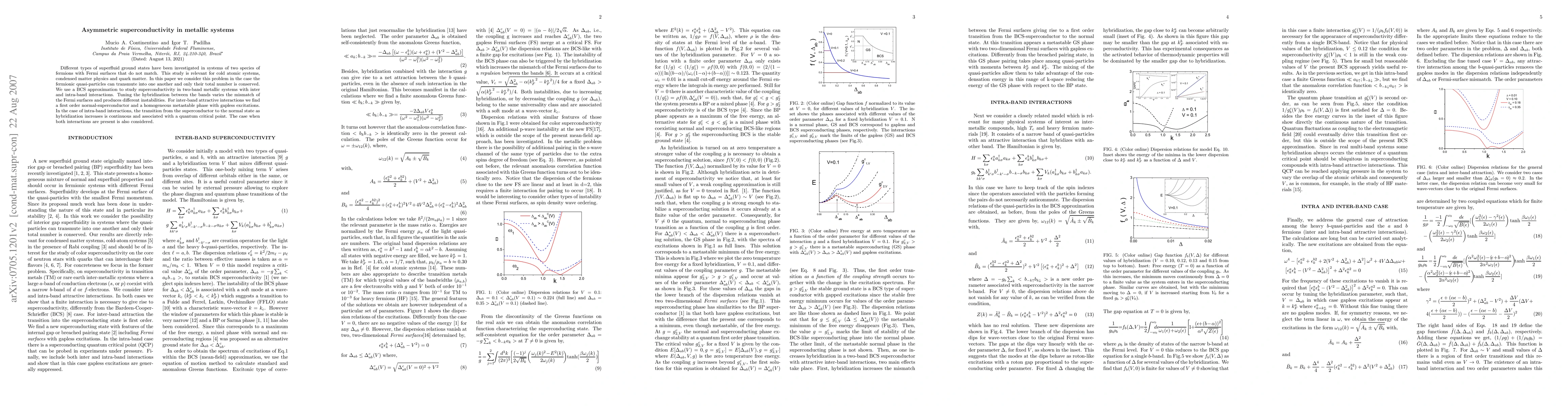 Different types of superfluid ground states have been investigated in systems of two species of fermions with Fermi surfaces that do not match. This study is relevant for cold atomic systems, condensed matter physics and quark matter. In this paper we consider this problem in the case the fermionic quasi-particles can transmute into one another and only their total number is conserved. We use a BCS approximation to study superconductivity in two-band metallic systems with inter and intra-band interactions. Tuning the hybridization between the bands varies the mismatch of the Fermi surfaces and produces different instabilities. For inter-band attractive interactions we find a first order normal-superconductor and a homogeneous metastable phase with gapless excitations. In the case of intra-band interactions, the transition from the superconductor to the normal state as hybridization increases is continuous and associated with a quantum critical point. The case when both interactions are present is also considered.
