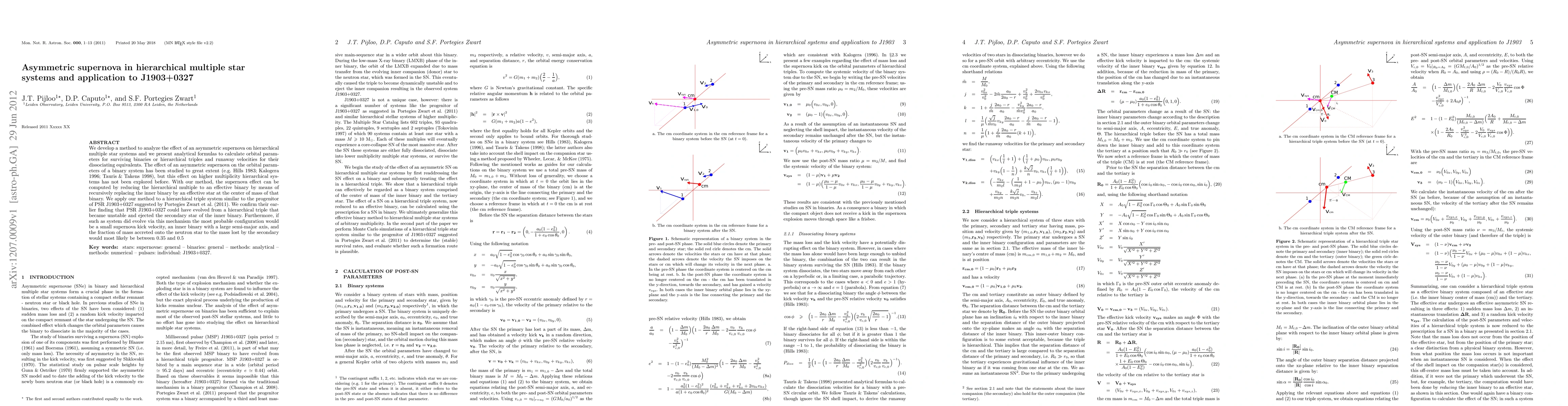 This paper develops a method to analyze asymmetric supernova effects on hierarchical multiple star systems, providing analytical formulas for orbital parameters and runaway velocities. It applies this method to PSR J1903+0327, confirming that it likely evolved from a hierarchical triple system with a small supernova kick and a large semi-major axis inner binary.