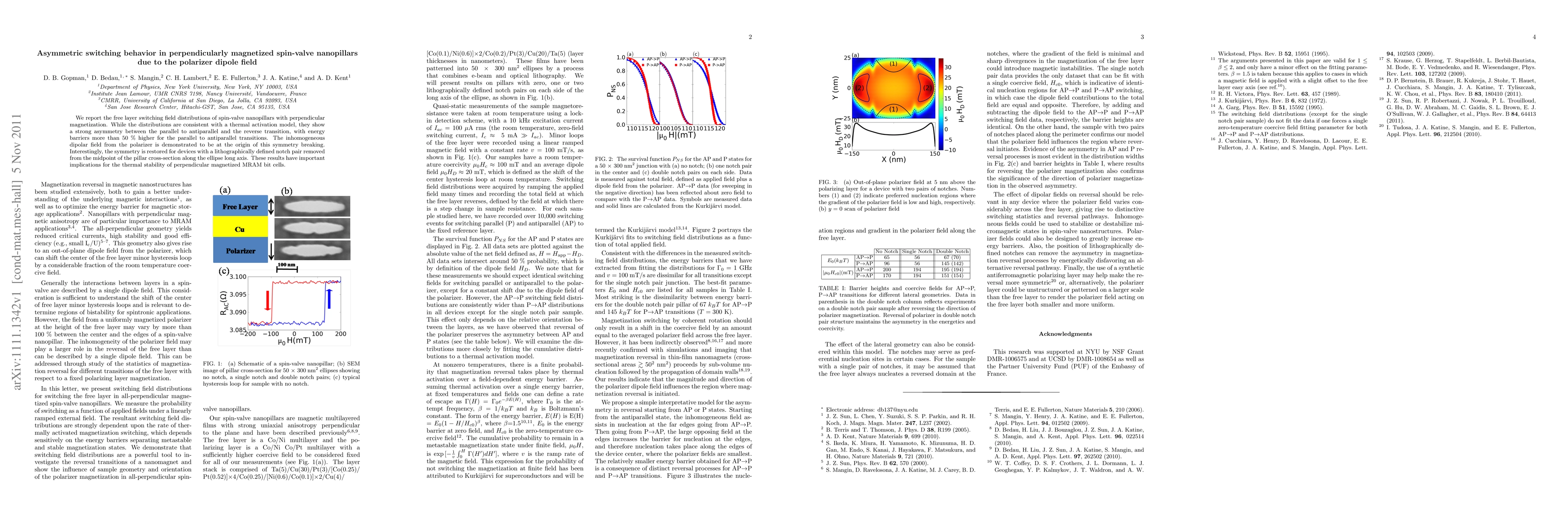 This paper investigates the asymmetric switching behavior in spin-valve nanopillars with perpendicular magnetization, attributing the asymmetry to the inhomogeneous dipolar field from the polarizer. Removing a notch pair restores symmetry, with implications for the thermal stability of MRAM bit cells.