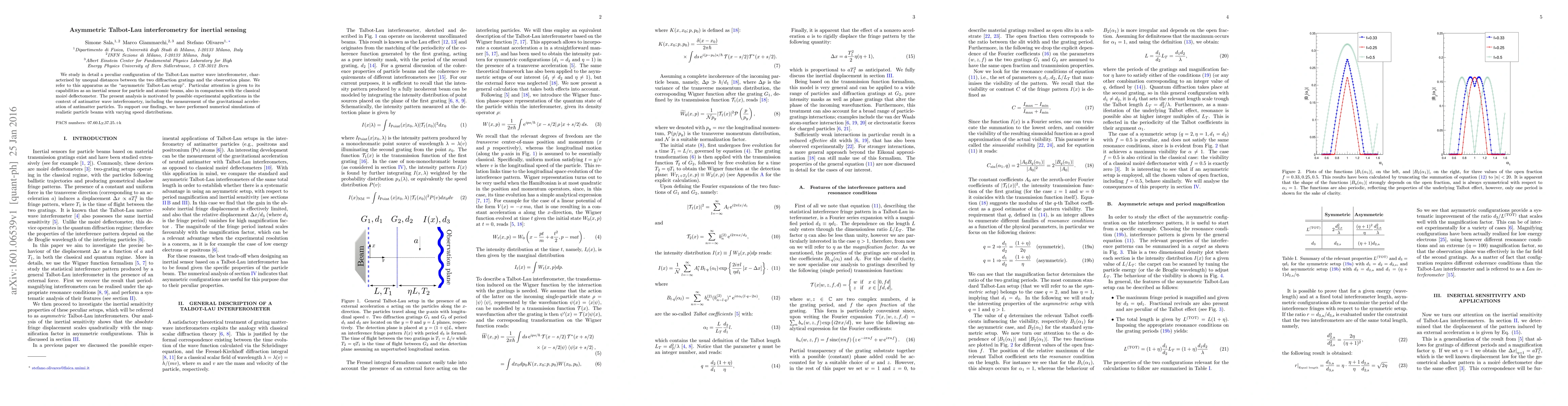 We study in detail a peculiar configuration of the Talbot-Lau matter wave interferometer, characterised by unequal distances between the two diffraction gratings and the observation plane. We refer to this apparatus as the "asymmetric Talbot-Lau setup". Particular attention is given to its capabilities as an inertial sensor for particle and atomic beams, also in comparison with the classical moir\'e deflectometer. The present analysis is motivated by possible experimental applications in the context of antimatter wave interferometry, including the measurement of the gravitational acceleration of antimatter particles. To support our findings, we have performed numerical simulations of realistic particle beams with varying speed distributions.