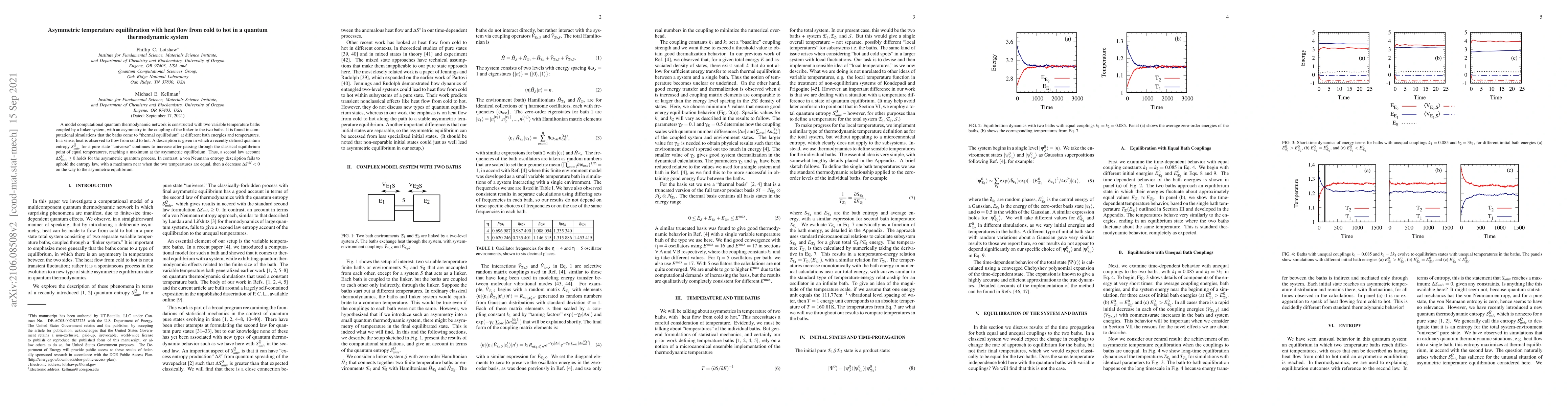 A model computational quantum thermodynamic network is constructed with two variable temperature baths coupled by a linker system, with an asymmetry in the coupling of the linker to the two baths. It is found in computational simulations that the baths come to "thermal equilibrium" at different bath energies and temperatures. In a sense, heat is observed to flow from cold to hot. A description is given in which a recently defined quantum entropy $S^Q_{univ}$ for a pure state "universe" continues to increase after passing through the classical equilibrium point of equal temperatures, reaching a maximum at the asymmetric equilibrium. Thus, a second law account $\Delta S^Q_{univ} \ge 0$ holds for the asymmetric quantum process. In contrast, a von Neumann entropy description fails to uphold the entropy law, with a maximum near when the two temperatures are equal, then a decrease $\Delta S^{vN} < 0$ on the way to the asymmetric equilibrium.