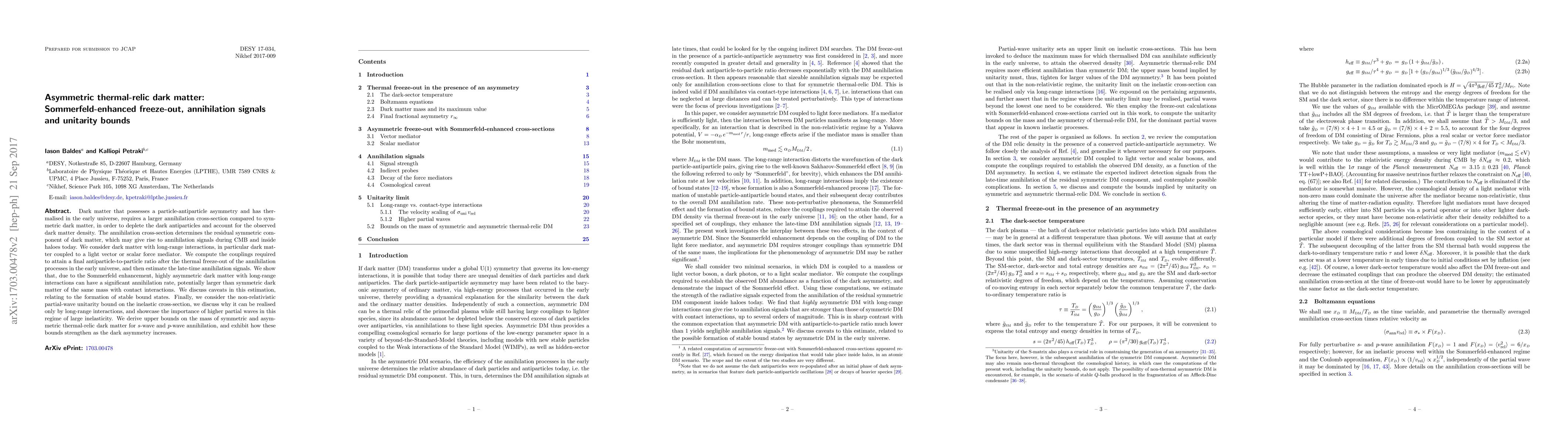 Dark matter that possesses a particle-antiparticle asymmetry and has thermalised in the early universe, requires a larger annihilation cross-section compared to symmetric dark matter, in order to deplete the dark antiparticles and account for the observed dark matter density. The annihilation cross-section determines the residual symmetric component of dark matter, which may give rise to annihilation signals during CMB and inside haloes today. We consider dark matter with long-range interactions, in particular dark matter coupled to a light vector or scalar force mediator. We compute the couplings required to attain a final antiparticle-to-particle ratio after the thermal freeze-out of the annihilation processes in the early universe, and then estimate the late-time annihilation signals. We show that, due to the Sommerfeld enhancement, highly asymmetric dark matter with long-range interactions can have a significant annihilation rate, potentially larger than symmetric dark matter of the same mass with contact interactions. We discuss caveats in this estimation, relating to the formation of stable bound states. Finally, we consider the non-relativistic partial-wave unitarity bound on the inelastic cross-section, we discuss why it can be realised only by long-range interactions, and showcase the importance of higher partial waves in this regime of large inelasticity. We derive upper bounds on the mass of symmetric and asymmetric thermal-relic dark matter for s-wave and p-wave annihilation, and exhibit how these bounds strengthen as the dark asymmetry increases.