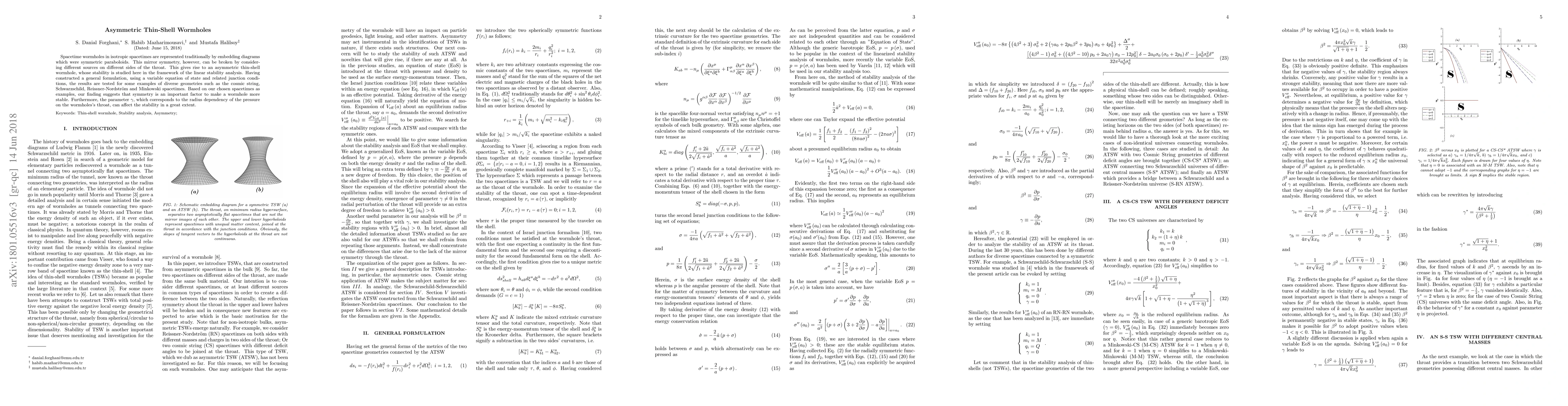 Spacetime wormholes in isotropic spacetimes are represented traditionally by embedding diagrams which were symmetric paraboloids. This mirror symmetry, however, can be broken by considering different sources on different sides of the throat. This gives rise to an asymmetric thin-shell wormhole, whose stability is studied here in the framework of the linear stability analysis. Having constructed a general formulation, using a variable equation of state and related junction conditions, the results are tested for some examples of diverse geometries such as the cosmic string, Schwarzschild, Reissner-Nordstr% \"{o}m and Minkowski spacetimes. Based on our chosen spacetimes as examples, our finding suggests that symmetry is an important factor to make a wormhole more stable. Furthermore, the parameter $\gamma $, which corresponds to the radius dependency of the pressure on the wormholes's throat, can affect the stability in a great extent.