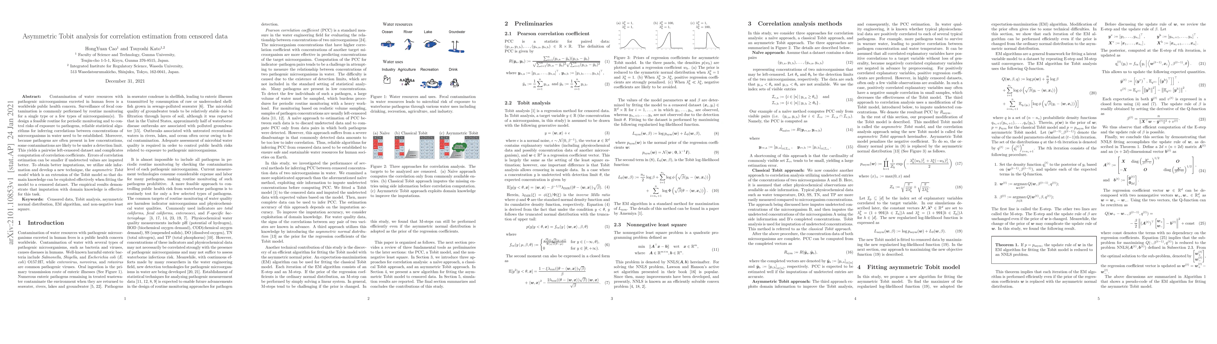This paper proposes an asymmetric Tobit model to estimate correlations between microbial concentrations in water, addressing the challenge of left-censored data due to low pathogen concentrations. The method leverages domain knowledge to improve imputations, leading to more accurate correlation estimations.
