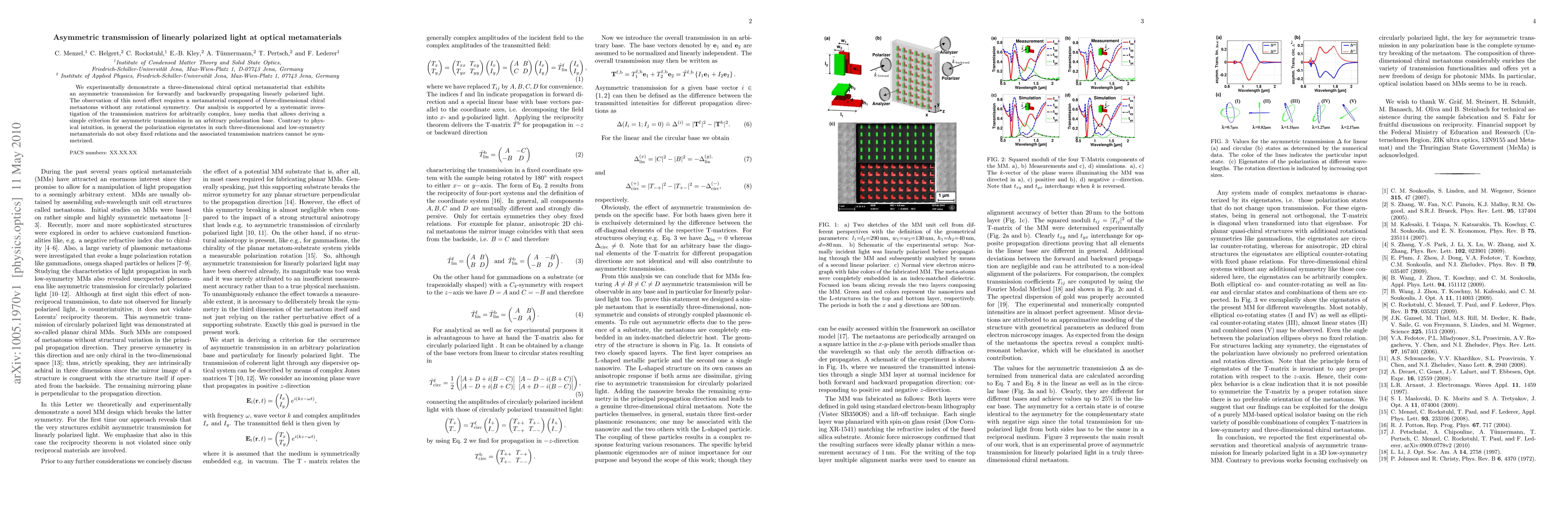 This paper demonstrates asymmetric transmission of linearly polarized light through a three-dimensional chiral optical metamaterial, showing distinct forward and backward propagation behavior. The metamaterial's unique three-dimensional chiral metaatoms, lacking rotational symmetry, enable this effect, supported by a detailed analysis of transmission matrices in complex, lossy media.