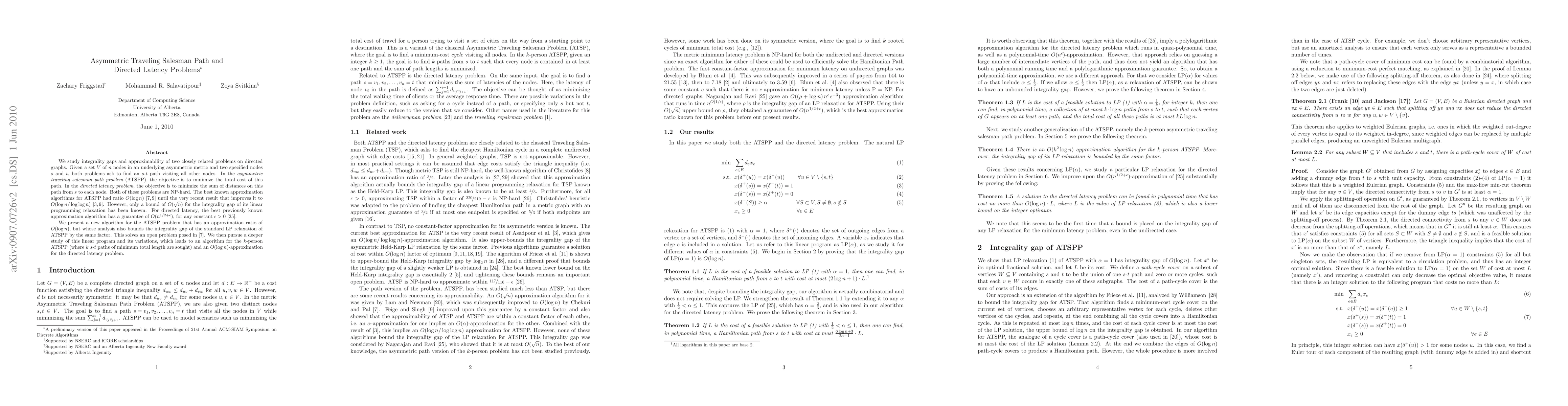 We study integrality gaps and approximability of two closely related problems on directed graphs. Given a set V of n nodes in an underlying asymmetric metric and two specified nodes s and t, both problems ask to find an s-t path visiting all other nodes. In the asymmetric traveling salesman path problem (ATSPP), the objective is to minimize the total cost of this path. In the directed latency problem, the objective is to minimize the sum of distances on this path from s to each node. Both of these problems are NP-hard. The best known approximation algorithms for ATSPP had ratio O(log n) until the very recent result that improves it to O(log n/ log log n). However, only a bound of O(sqrt(n)) for the integrality gap of its linear programming relaxation has been known. For directed latency, the best previously known approximation algorithm has a guarantee of O(n^(1/2+eps)), for any constant eps > 0. We present a new algorithm for the ATSPP problem that has an approximation ratio of O(log n), but whose analysis also bounds the integrality gap of the standard LP relaxation of ATSPP by the same factor. This solves an open problem posed by Chekuri and Pal [2007]. We then pursue a deeper study of this linear program and its variations, which leads to an algorithm for the k-person ATSPP (where k s-t paths of minimum total length are sought) and an O(log n)-approximation for the directed latency problem.