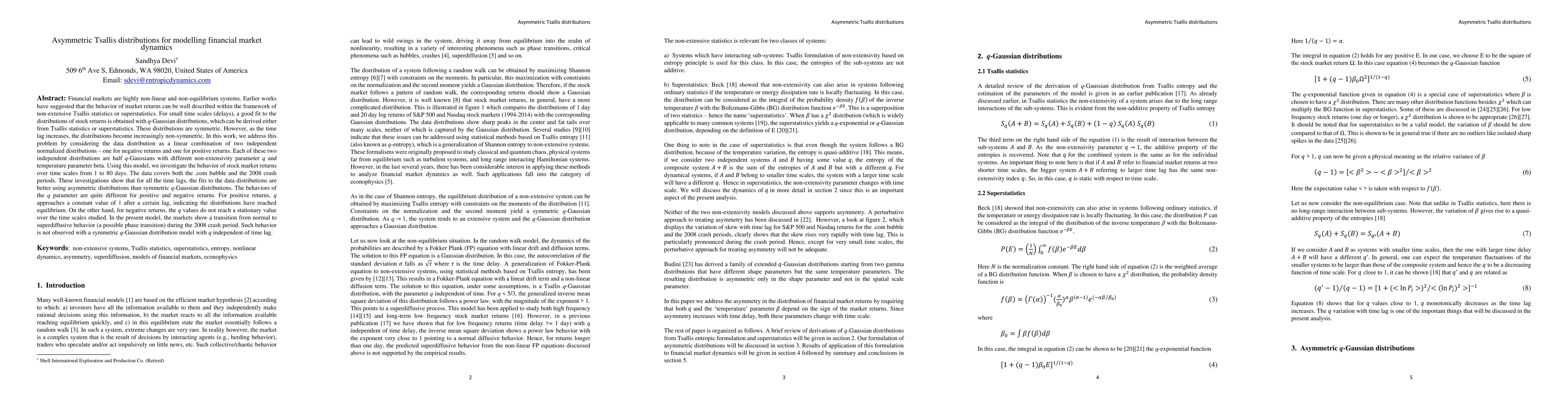 Financial markets are highly non-linear and non-equilibrium systems. Earlier works have suggested that the behavior of market returns can be well described within the framework of non-extensive Tsallis statistics or superstatistics. For small time scales (delays), a good fit to the distributions of stock returns is obtained with q-Gaussian distributions, which can be derived either from Tsallis statistics or superstatistics. These distributions are symmetric. However, as the time lag increases, the distributions become increasingly non-symmetric. In this work, we address this problem by considering the data distribution as a linear combination of two independent normalized distributions - one for negative returns and one for positive returns. Each of these two independent distributions are half q-Gaussians with different non-extensivity parameter q and temperature parameter beta. Using this model, we investigate the behavior of stock market returns over time scales from 1 to 80 days. The data covers both the .com bubble and the 2008 crash periods. These investigations show that for all the time lags, the fits to the data distributions are better using asymmetric distributions than symmetric q-Gaussian distributions. The behaviors of the q parameter are quite different for positive and negative returns. For positive returns, q approaches a constant value of 1 after a certain lag, indicating the distributions have reached equilibrium. On the other hand, for negative returns, the q values do not reach a stationary value over the time scales studied. In the present model, the markets show a transition from normal to superdiffusive behavior (a possible phase transition) during the 2008 crash period. Such behavior is not observed with a symmetric q-Gaussian distribution model with q independent of time lag.