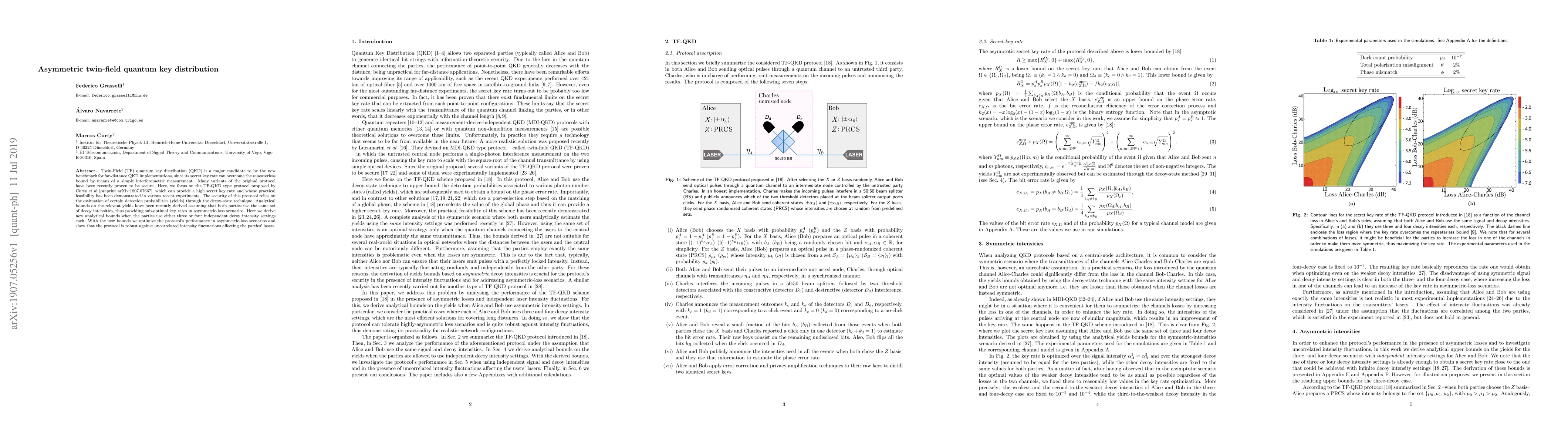 Twin-Field (TF) quantum key distribution (QKD) is a major candidate to be the new benchmark for far-distance QKD implementations, since its secret key rate can overcome the repeaterless bound by means of a simple interferometric measurement. Many variants of the original protocol have been recently proven to be secure. Here, we focus on the TF-QKD type protocol proposed by Curty et al [preprint arXiv:1807.07667], which can provide a high secret key rate and whose practical feasibility has been demonstrated in various recent experiments. The security of this protocol relies on the estimation of certain detection probabilities (yields) through the decoy-state technique. Analytical bounds on the relevant yields have been recently derived assuming that both parties use the same set of decoy intensities, thus providing sub-optimal key rates in asymmetric-loss scenarios. Here we derive new analytical bounds when the parties use either three or four independent decoy intensity settings each. With the new bounds we optimize the protocol's performance in asymmetric-loss scenarios and show that the protocol is robust against uncorrelated intensity fluctuations affecting the parties' lasers.