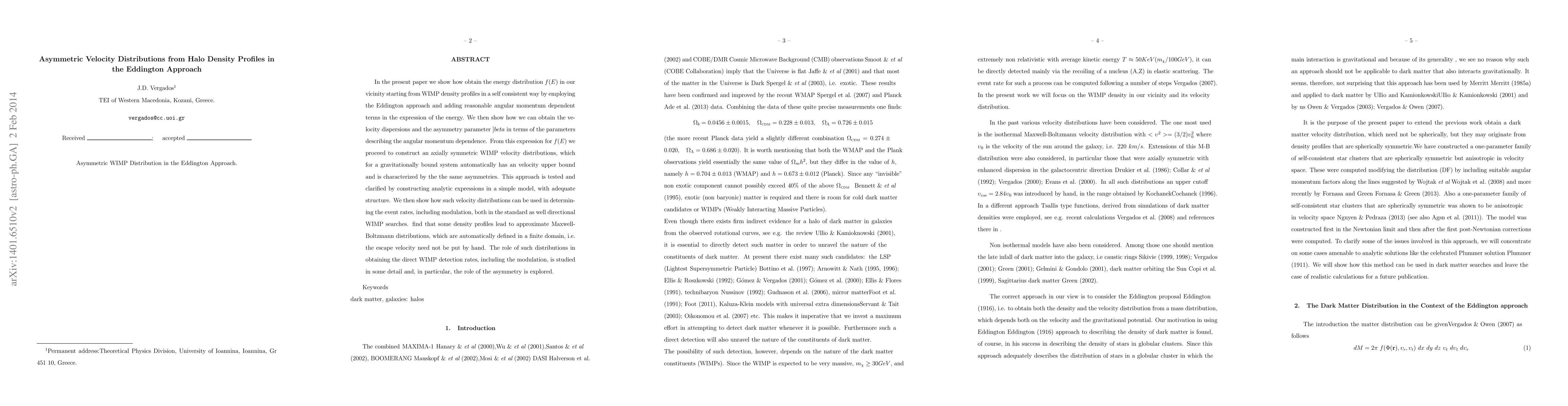 In the present paper we show how obtain the energy distribution f(E) in our vicinity starting from WIMP density profiles in a self consistent way by employing the Eddington approach and adding reasonable angular momentum dependent terms in the expression of the energy. We then show how we can obtain the velocity dispersion and the asymmetry parameter {\beta} in terms of the parameters describing the angular momentum dependence. From this expression for f(E) we proceed to construct an axially symmetric WIMP velocity distributions, which for a gravitationally bound system automatically has an velocity upper bound and is characterized by the the same asymmetries. This approach is tested and clarified by constructing analytic expressions in a simple model, with adequate structure. We then show how such velocity distributions can be used in determining the event rates, including modulation, both in the standard as well directional WIMP searches. find that some density profiles lead to approximate Maxwell-Boltzmann distributions, which are automatically defined in a finite domain, i.e. the escape velocity need not be put by hand. The role of such distributions in obtaining the direct WIMP detection rates, including the modulation, is studied in some detail and, in particular, the role of the asymmetry is explored.