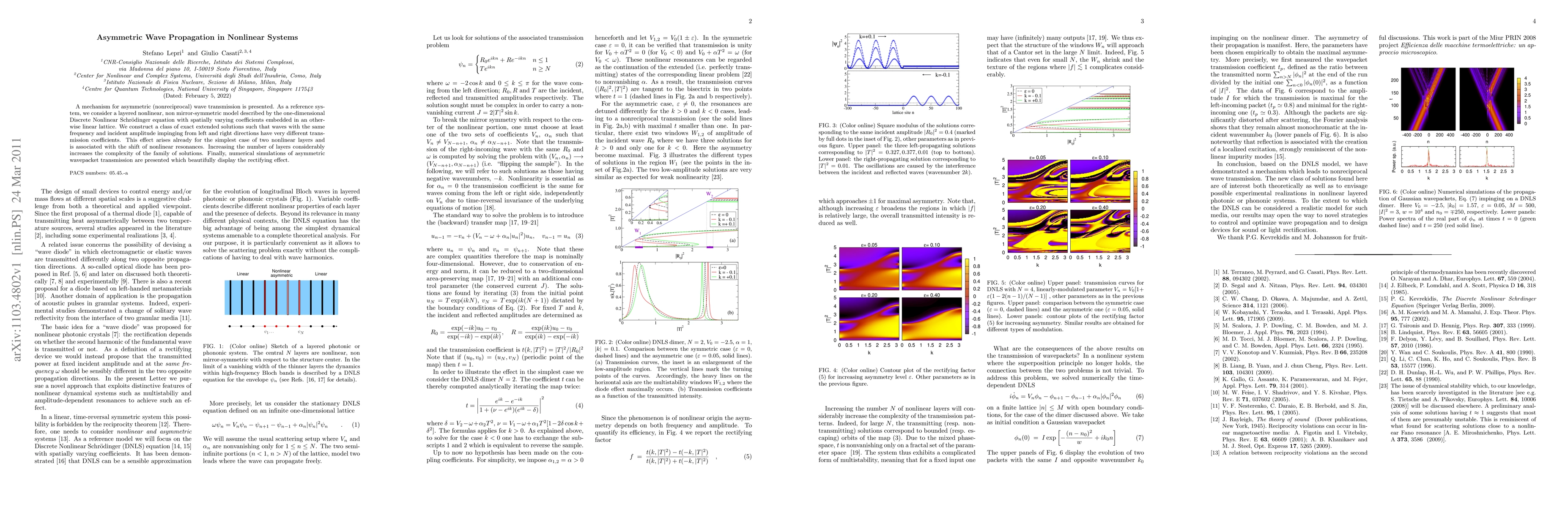 A mechanism for asymmetric (nonreciprocal) wave transmission is presented. As a reference system, we consider a layered nonlinear, non mirror-symmetric model described by the one-dimensional Discrete Nonlinear Schreodinger equation with spatially varying coefficients embedded in an otherwise linear lattice. We construct a class of exact extended solutions such that waves with the same frequency and incident amplitude impinging from left and right directions have very different transmission coefficients. This effect arises already for the simplest case of two nonlinear layers and is associated with the shift of nonlinear resonances. Increasing the number of layers considerably increases the complexity of the family of solutions. Finally, numerical simulations of asymmetric wavepacket transmission are presented which beautifully display the rectifying effect.