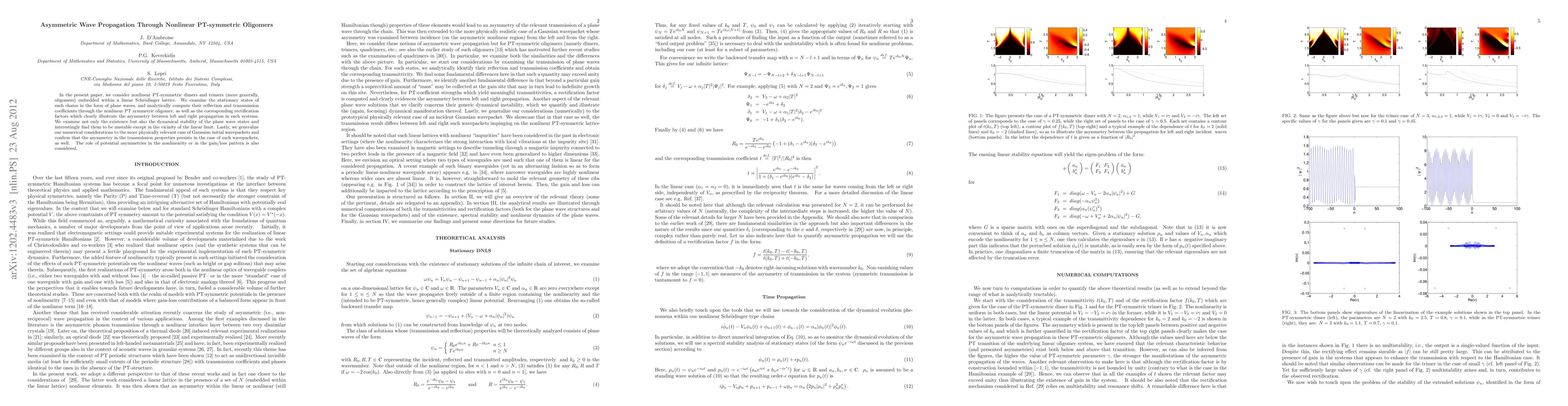This paper investigates asymmetric wave propagation through nonlinear PT-symmetric oligomers, finding that plane wave states are generically unstable and exhibit asymmetry in reflection and transmission coefficients.