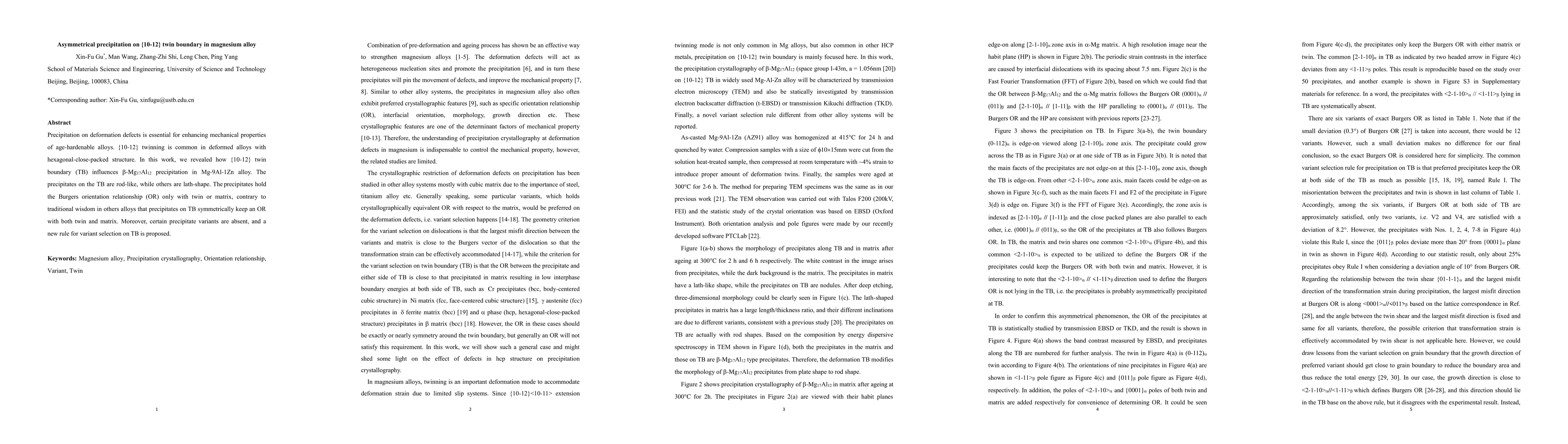 Precipitation on deformation defects is essential for enhancing mechanical properties of age-hardenable alloys. {10-12} twinning is common in deformed alloys with hexagonal-close-packed structure. In this work, we revealed how {10-12} twin boundary (TB) influences beta-Mg17Al12 precipitation in Mg-9Al-1Zn alloy. The precipitates on the TB are rod-like, while others are lath-shape. The precipitates hold the Burgers orientation relationship (OR) only with twin or matrix, contrary to traditional wisdom in others alloys that precipitates on TB symmetrically keep an OR with both twin and matrix. Moreover, certain precipitate variants are absent, and a new rule for variant selection on TB is proposed.