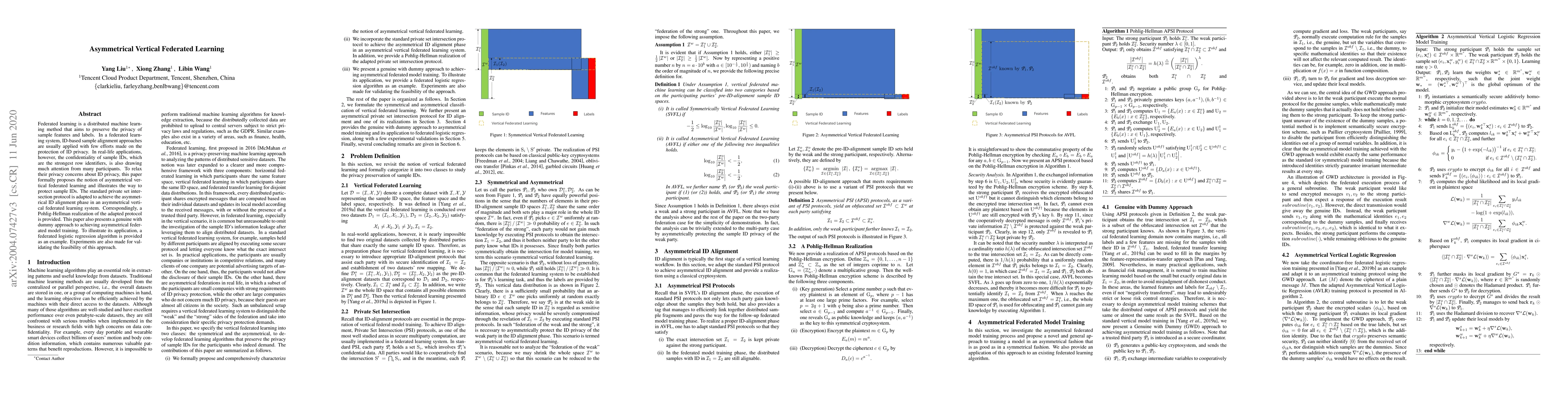 This paper introduces asymmetrical vertical federated learning to protect sample IDs in federated learning, adapting the private set intersection protocol for ID alignment. It also presents a method for federated model training using a genuine with dummy approach, validated through a federated logistic regression example.