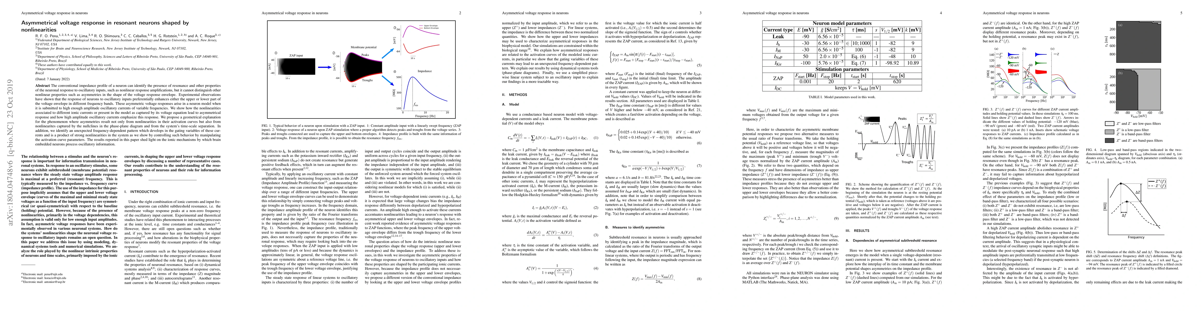 The conventional impedance profile of a neuron can identify the presence of resonance and other properties of the neuronal response to oscillatory inputs, such as nonlinear response amplifications, but it cannot distinguish other nonlinear properties such as asymmetries in the shape of the voltage response envelope. Experimental observations have shown that the response of neurons to oscillatory inputs preferentially enhances either the upper or lower part of the voltage envelope in different frequency bands. These asymmetric voltage responses arise in a neuron model when it is submitted to high enough amplitude oscillatory currents of variable frequencies. We show how the nonlinearities associated to different ionic currents or present in the model as captured by its voltage equation lead to asymmetrical response and how high amplitude oscillatory currents emphasize this response. We propose a geometrical explanation for the phenomenon where asymmetries result not only from nonlinearities in their activation curves but also from nonlinearites captured by the nullclines in the phase-plane diagram and from the system's time-scale separation. In addition, we identify an unexpected frequency-dependent pattern which develops in the gating variables of these currents and is a product of strong nonlinearities in the system as we show by controlling such behavior by manipulating the activation curve parameters. The results reported in this paper shed light on the ionic mechanisms by which brain embedded neurons process oscillatory information.