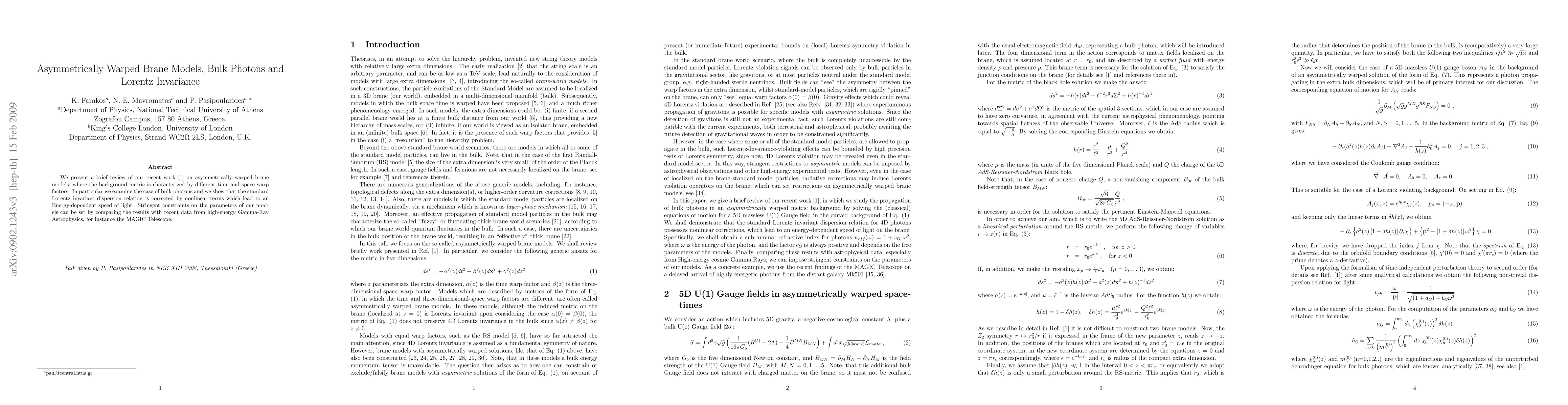 This paper reviews asymmetrically warped brane models with distinct time and space warp factors, focusing on bulk photons and their modified dispersion relation. The study finds that Lorentz invariance is violated, leading to an energy-dependent speed of light, with constraints on model parameters derived from high-energy gamma-ray data.