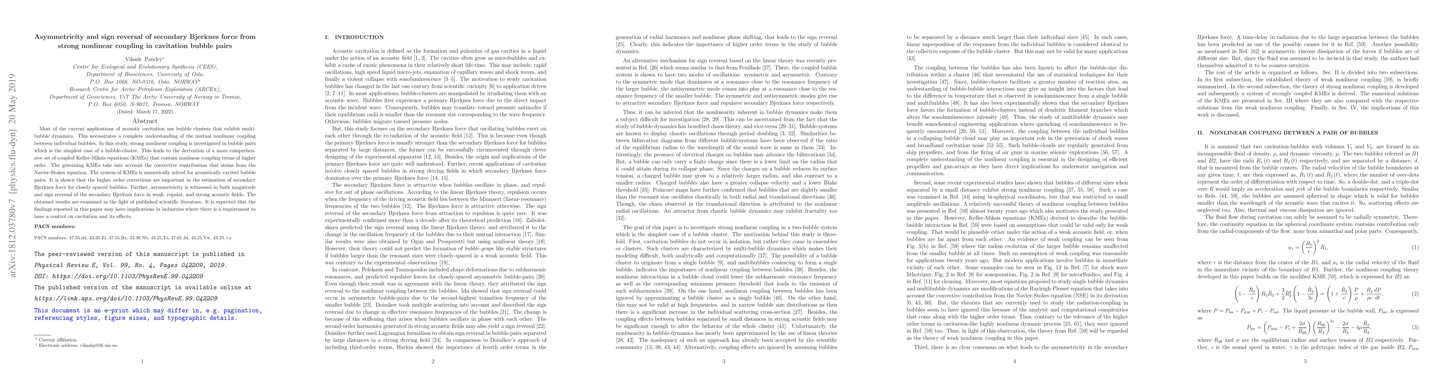 Most of the current applications of acoustic cavitation use bubble clusters that exhibit multibubble dynamics. This necessitates a complete understanding of the mutual nonlinear coupling between individual bubbles. In this study, strong nonlinear coupling is investigated in bubble pairs which is the simplest case of a bubble-cluster. This leads to the derivation of a more comprehensive set of coupled Keller-Miksis equations (KMEs) that contain nonlinear coupling terms of higher order. The governing KMEs take into account the convective contribution that stems from the Navier-Stokes equation. The system of KMEs is numerically solved for acoustically excited bubble pairs. It is shown that the higher order corrections are important in the estimation of secondary Bjerknes force for closely spaced bubbles. Further, asymmetricity is witnessed in both magnitude and sign reversal of the secondary Bjerknes force in weak, regular, and strong acoustic fields. The obtained results are examined in the light of published scientific literature. It is expected that the findings reported in this paper may have implications in industries where there is a requirement to have a control on cavitation and its effects.