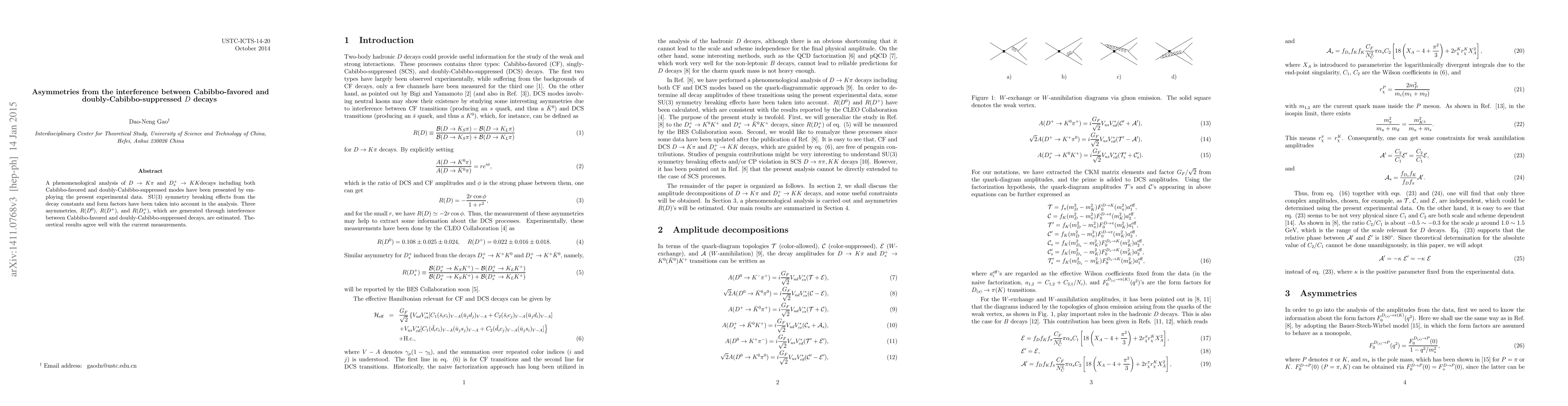 A phenomenological analysis of $D\to K\pi$ and $D_s^+\to K K $decays including both Cabibbo-favored and doubly-Cabibbo-suppressed modes have been presented by employing the present experimental data. SU(3) symmetry breaking effects from the decay constants and form factors have been taken into account in the analysis. Three asymmetries, $R(D^0)$, $R(D^+)$, and $R(D_s^+)$, which are generated through interference between Cabbibo-favored and doubly- Cabibbo-suppressed decays, are estimated. Theoretical results agree well with the current measurements.