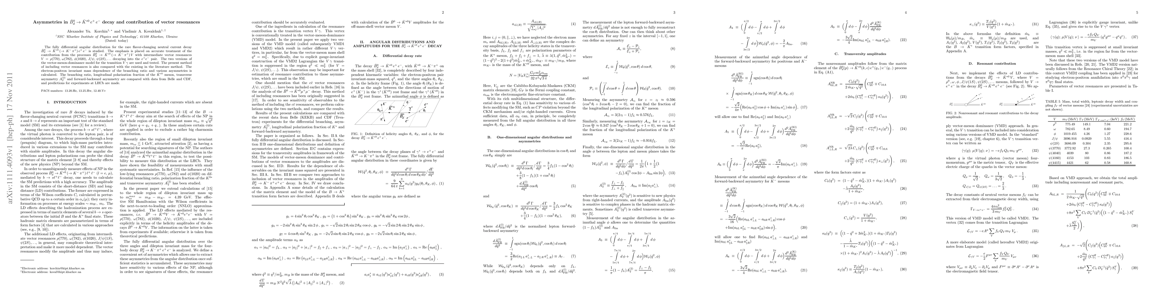This paper studies the angular distribution of the decay {\bar B}_d^0 -> {\bar K}^{*0} e+ e- with a focus on the contributions from vector resonances. It compares the effects of different vector-meson-dominance models and evaluates the electron-positron invariant mass dependence, comparing results with experimental data from Belle and CDF and making predictions for LHCb.