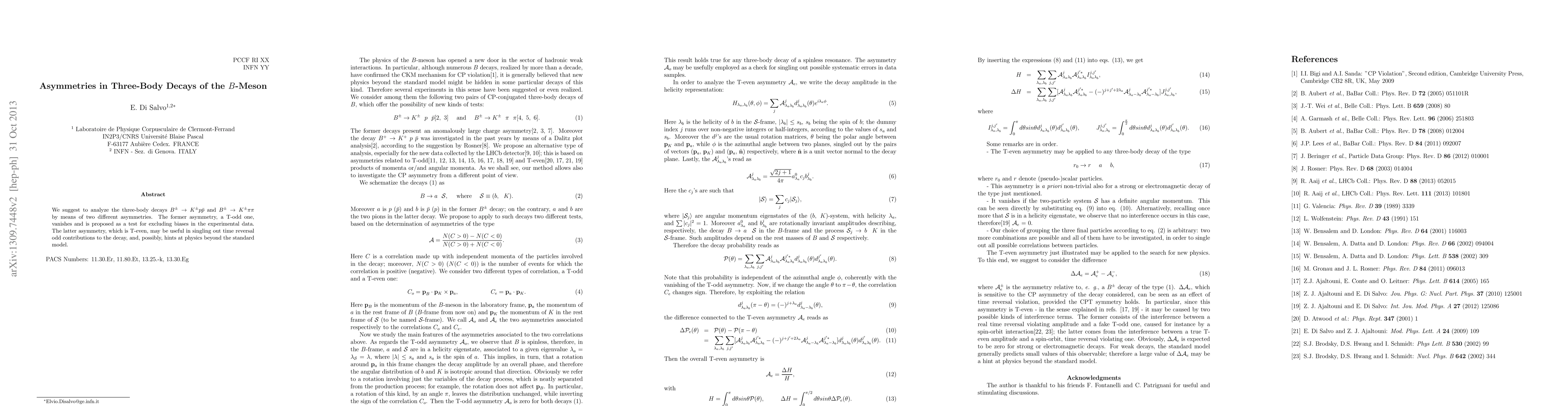 We suggest to analyze the three-body decays B+- to $K+- p pbar$ and to $K+- \pi \pi$ by means of two different asymmetries. The former asymmetry, a T-odd one, vanishes and is proposed as a test for excluding biases in the experimental data. The latter asymmetry, which is T-even, may be useful in singling out time reversal odd contributions to the decay, and, possibly, hints at physics beyond the standard model.