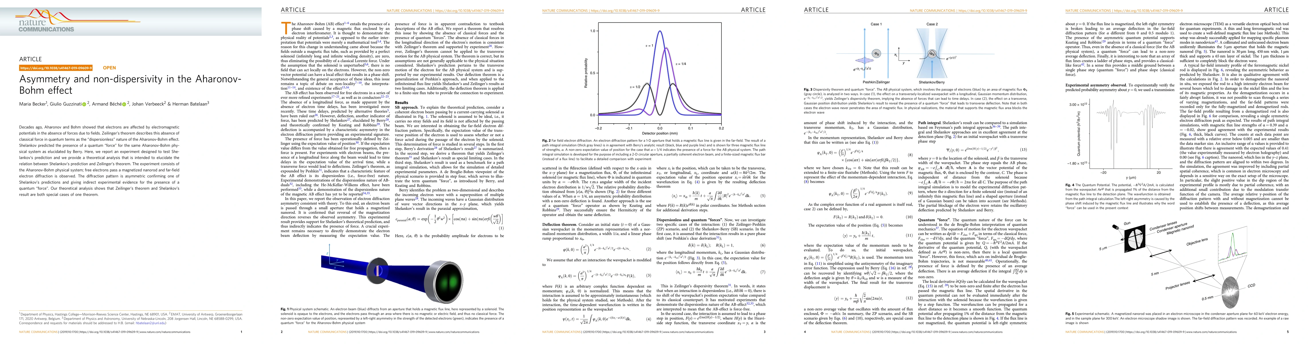 Decades ago, Aharonov and Bohm showed that electrons are affected by electromagnetic potentials in the absence of forces due to fields. Zeilinger's theorem describes this absence of classical force in quantum terms as the "dispersionless" nature of the Aharonov-Bohm effect. Shelankov predicted the presence of a quantum "force" for the same Aharonov-Bohm physical system as elucidated by Berry. Here, we report an experiment designed to test Shelankov's prediction and we provide a theoretical analysis that is intended to elucidate the relation between Shelankov's prediction and Zeilinger's theorem. The experiment consists of the Aharonov--Bohm physical system; free electrons pass a magnetized nanorod and far--field electron diffraction is observed. The diffraction pattern is asymmetric confirming one of Shelankov's predictions and giving indirect experimental evidence for the presence of a quantum "force". Our theoretical analysis shows that Zeilinger's theorem and Shelankov's result are both special cases of one theorem.