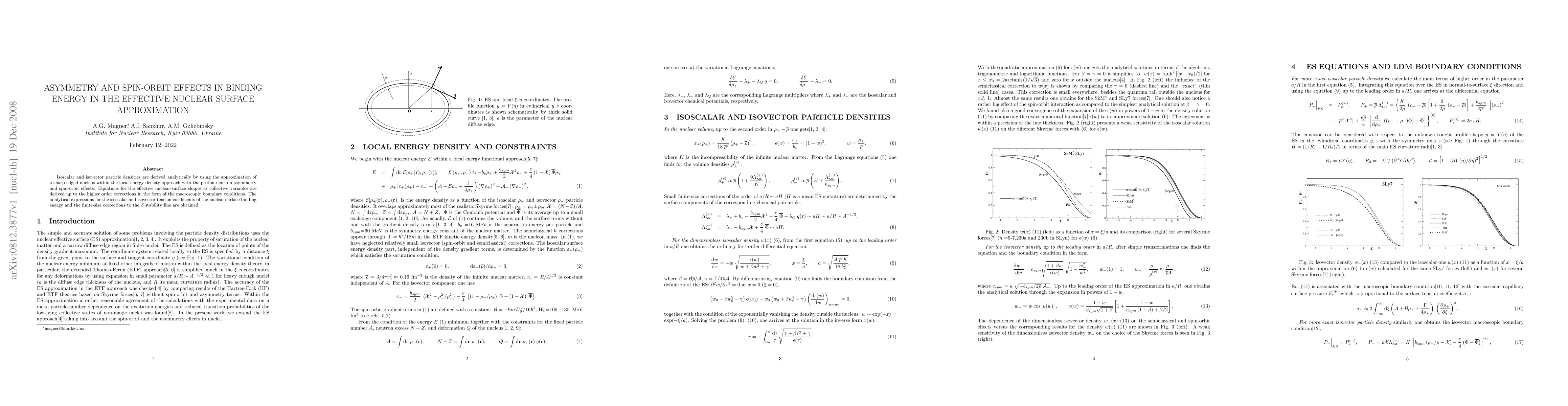 This paper derives analytical expressions for isoscalar and isovector particle densities and effective nuclear-surface shapes, incorporating proton-neutron asymmetry and spin-orbit effects within the local energy density approach. It also obtains analytical expressions for tension coefficients and finite-size corrections to the nuclear binding energy.