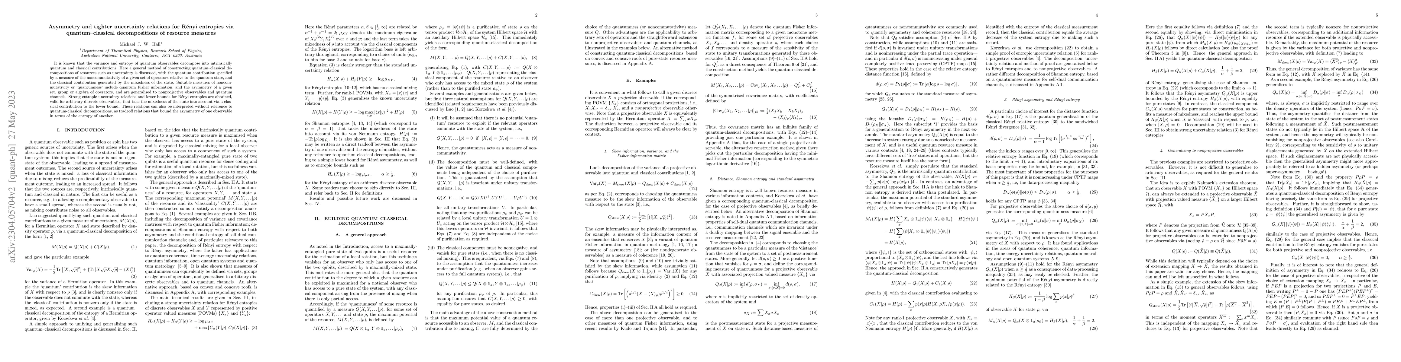 It is known that the variance and entropy of quantum observables decompose into intrinsically quantum and classical contributions. Here a general method of constructing quantum-classical decompositions of resources such as uncertainty is discussed, with the quantum contribution specified by a measure of the noncommutativity of a given set of operators relative to the quantum state, and the classical contribution generated by the mixedness of the state. Suitable measures of noncommutativity or 'quantumness' include quantum Fisher information, and the asymmetry of a given set, group or algebra of operators, and are generalised to nonprojective observables and quantum channels. Strong entropic uncertainty relations and lower bounds for R\'enyi entropies are obtained, valid for arbitrary discrete observables, that take the mixedness of the state into account via a classical contribution to the lower bound. These relations can also be interpreted without reference to quantum-classical decompositions, as tradeoff relations that bound the asymmetry of one observable in terms of the entropy of another.