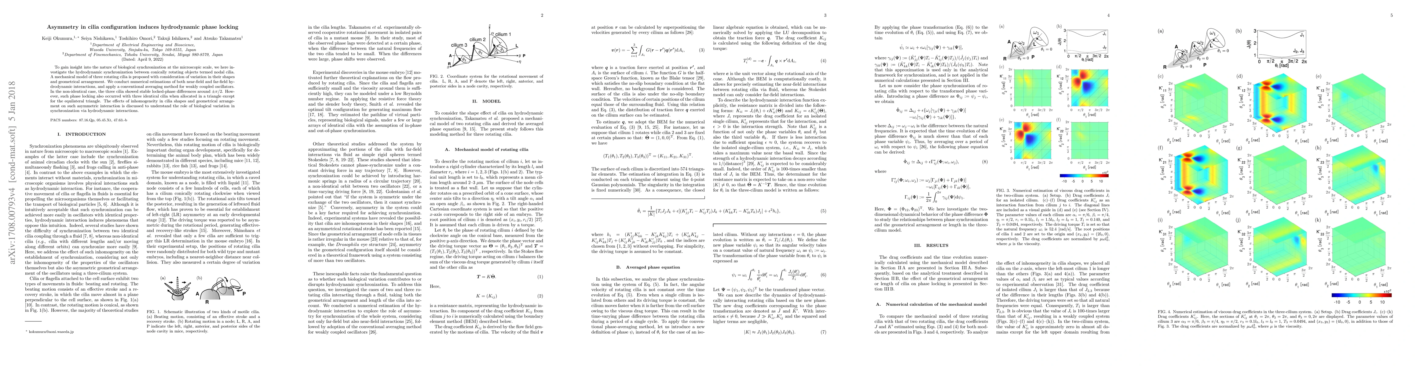 Research shows that cilia configuration can induce hydrodynamic phase locking in conically rotating objects, with non-identical cilia configurations demonstrating stable locked-phase differences of around ±π/2. Identical cilia configurations showed similar phase locking behavior, except in equilateral triangle arrangements.