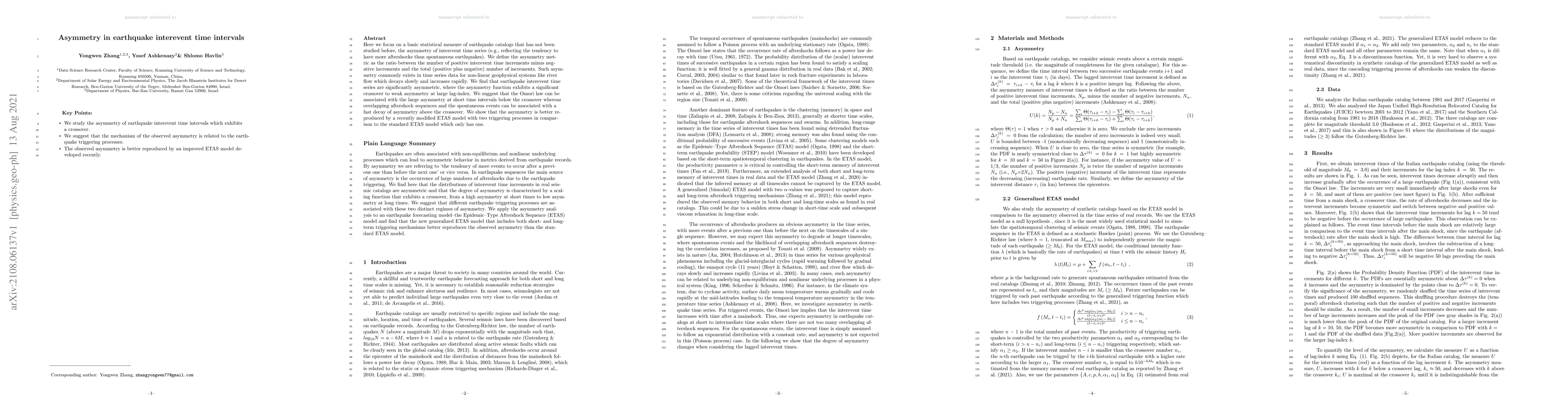This study introduces a new asymmetry metric for earthquake interevent time series, revealing significant asymmetry indicative of more aftershocks than spontaneous earthquakes. The asymmetry diminishes at large intervals, suggesting different triggering processes govern short-term and long-term earthquake dynamics, better captured by a modified ETAS model.