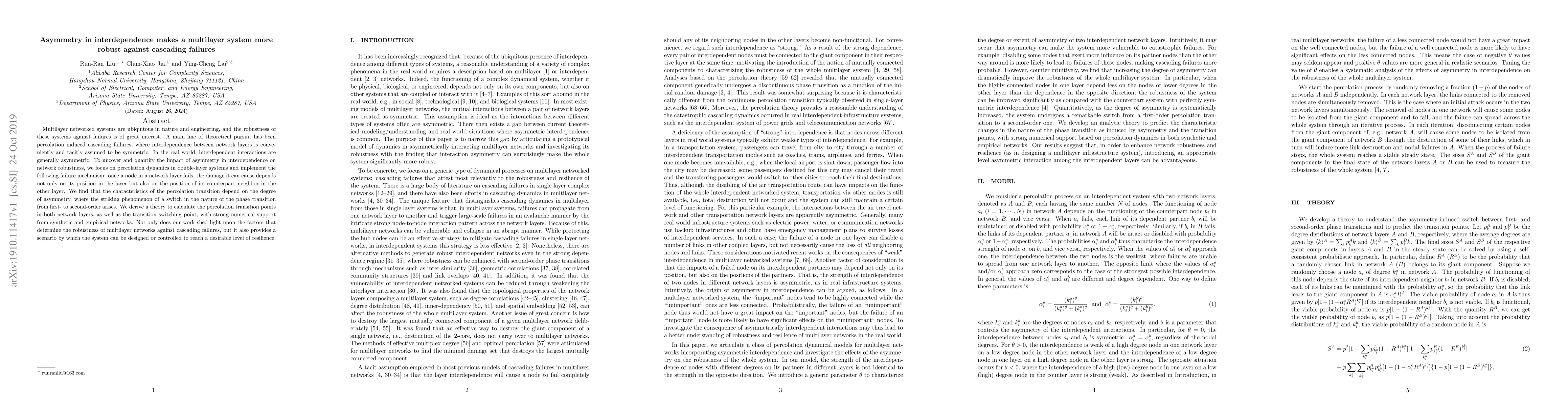 This paper investigates how asymmetry in interdependence between network layers affects the robustness of multilayer systems against cascading failures. It reveals that asymmetric interdependence can lead to a switch in the nature of the percolation transition, enhancing the system's resilience, and provides a theoretical framework to calculate these transition points.