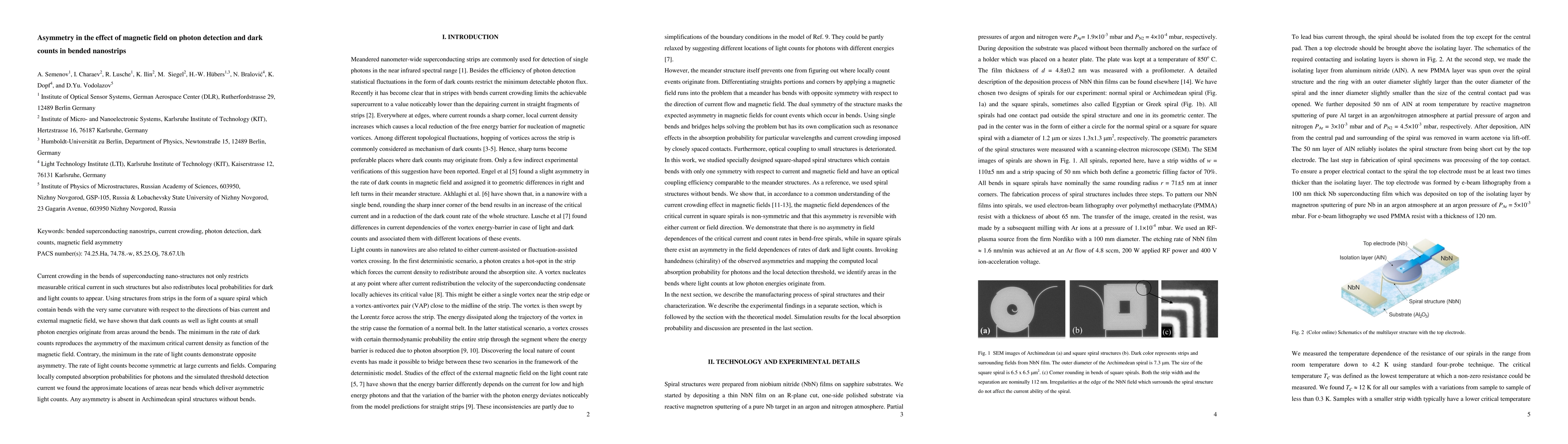 This research investigates the impact of magnetic fields on photon detection and dark counts in superconducting nanostrips, particularly focusing on bended structures. It reveals that current crowding in bends causes asymmetric effects on dark and light counts, with the minimum dark count rate mirroring the asymmetry in critical current density, while light counts show opposite asymmetry, becoming symmetric at high currents and fields.