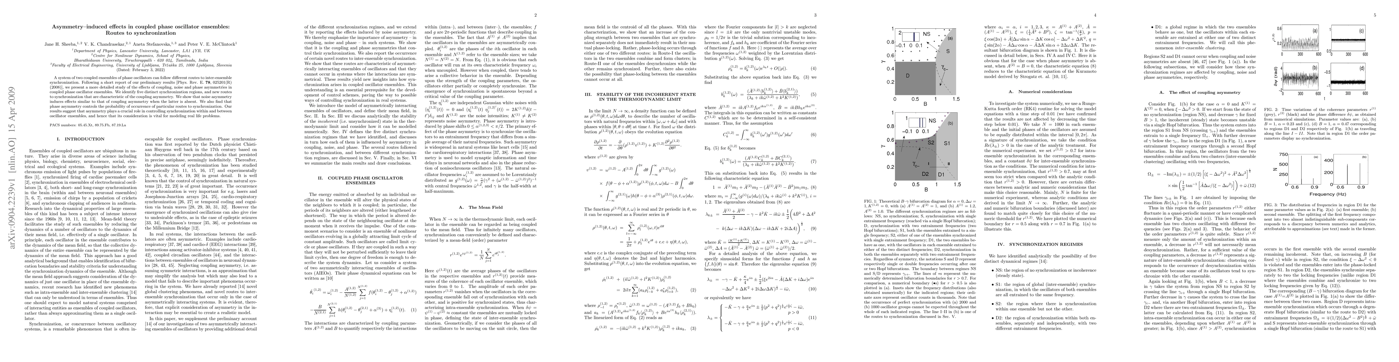 A system of two coupled ensembles of phase oscillators can follow different routes to inter-ensemble synchronization. Following a short report of our preliminary results [Phys. Rev. E. {\bf 78}, 025201(R) (2008)], we present a more detailed study of the effects of coupling, noise and phase asymmetries in coupled phase oscillator ensembles. We identify five distinct synchronization regions, and new routes to synchronization that are characteristic of the coupling asymmetry. We show that noise asymmetry induces effects similar to that of coupling asymmetry when the latter is absent. We also find that phase asymmetry controls the probability of occurrence of particular routes to synchronization. Our results suggest that asymmetry plays a crucial role in controlling synchronization within and between oscillator ensembles, and hence that its consideration is vital for modeling real life problems.
