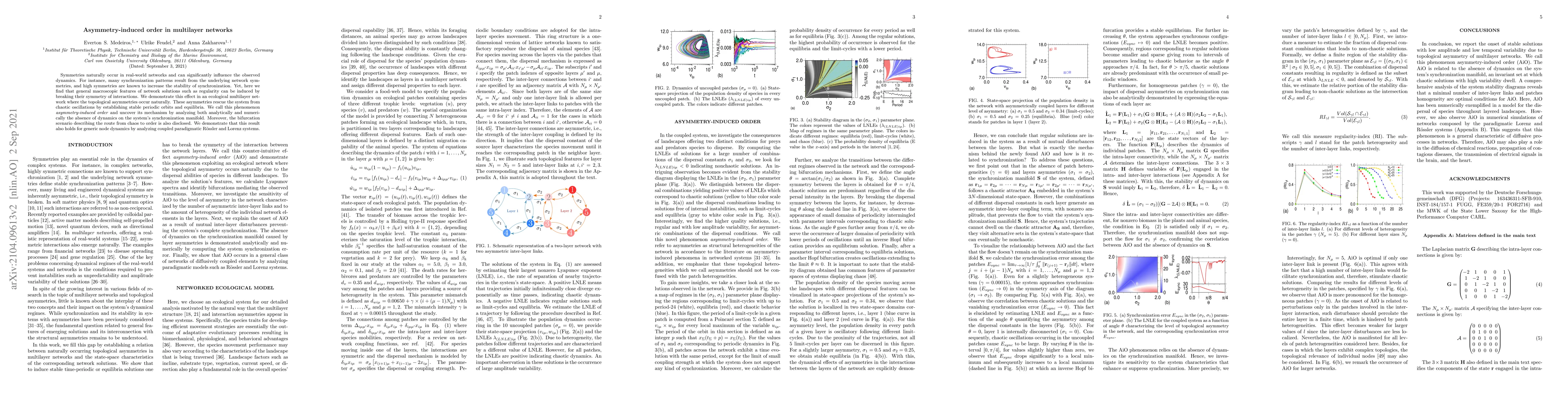 Research finds that breaking symmetry in multilayer networks can induce order, leading to stable periodic orbits and equilibria, even in chaotic systems. This phenomenon, called asymmetry-induced order, holds true for generic node dynamics in both ecological and paradigmatic R"ossler and Lorenz systems.