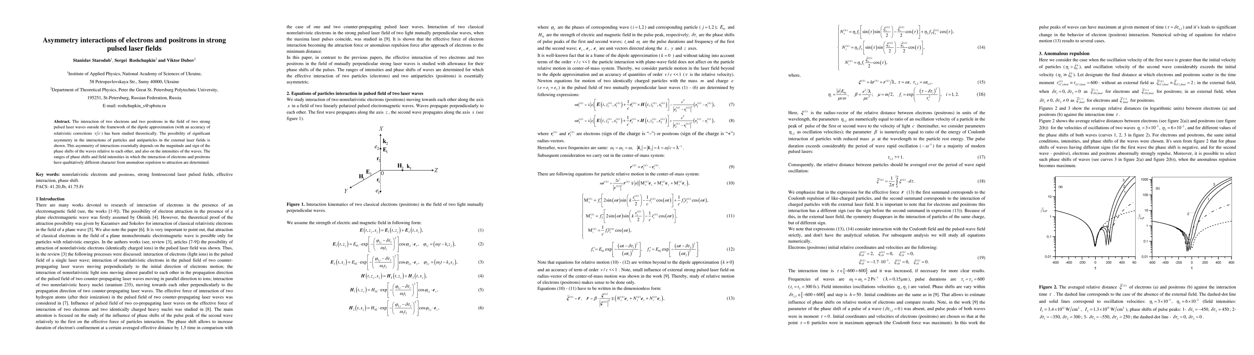 The interaction of two electrons and two positrons in the field of two strong pulsed laser waves outside the framework of the dipole approximation (with an accuracy of relativistic corrections ) has been studied theoretically. The possibility of significant asymmetry in the interactions of particles and antiparticles in the external laser fields is shown. This asymmetry of interactions essentially depends on the magnitude and sign of the phase shifts of the waves relative to each other, and also on the intensities of the waves. The ranges of phase shifts and field intensities in which the interaction of electrons and positrons have qualitatively different character from anomalous repulsion to attraction are determined.