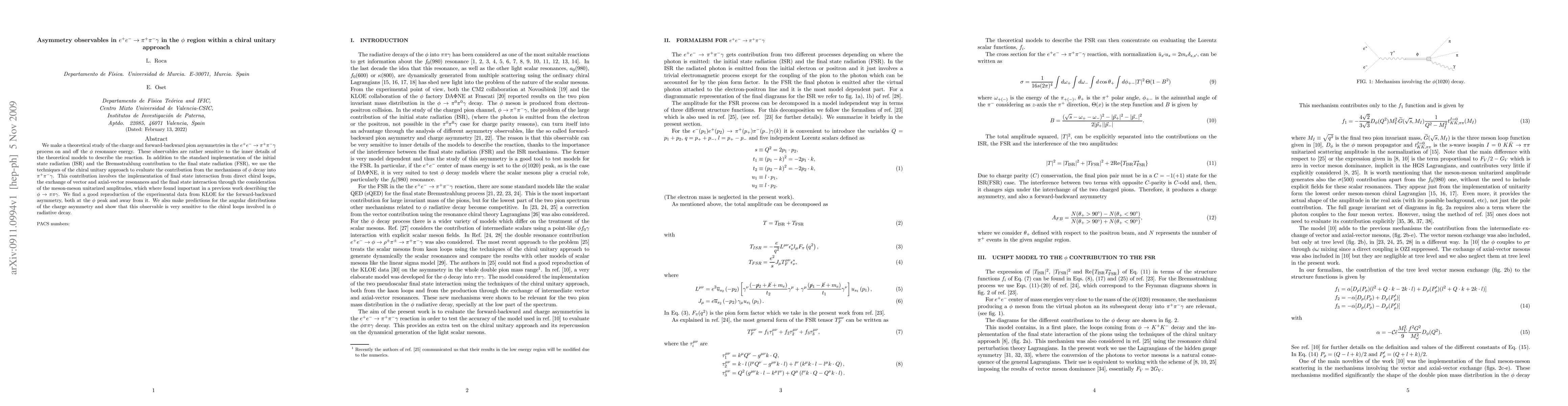 We make a theoretical study of the charge and forward-backward pion asymmetries in the e+e- --> pi+ pi- gamma process on and off the phi resonance energy. These observables are rather sensitive to the inner details of the theoretical models to describe the reaction. In addition to the standard implementation of the initial state radiation (ISR) and the Bremsstrahlung contribution to the final state radiation (FSR), we use the techniques of the chiral unitary approach to evaluate the contribution from the mechanisms of phi decay into pi+pi-gamma. This contribution involves the implementation of final state interaction from direct chiral loops, the exchange of vector and axial-vector resonances and the final state interaction through the consideration of the meson-meson unitarized amplitudes, which where found important in a previous work describing the phi --> pi pi gamma. We find a good reproduction of the experimental data from KLOE for the forward-backward asymmetry, both at the phi peak and away from it. We also make predictions for the angular distributions of the charge asymmetry and show that this observable is very sensitive to the chiral loops involved in phi radiative decay.